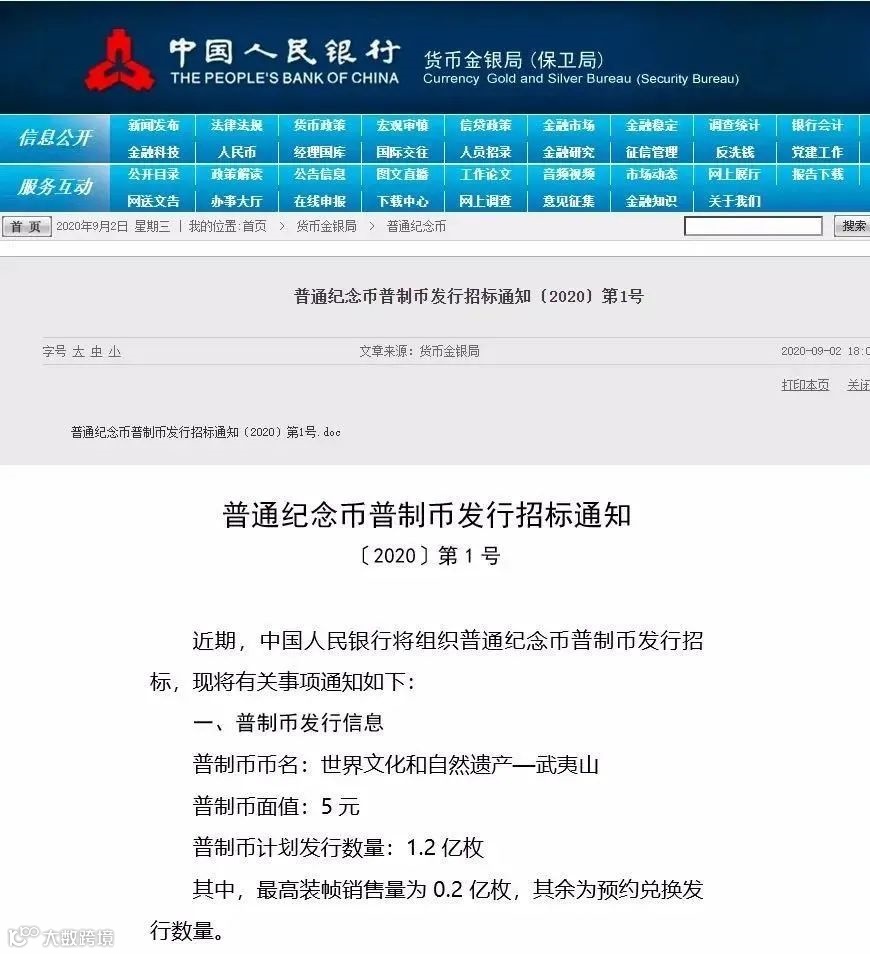 据招标通知,我们已经知道武夷山币的发行量是1.2亿,与泰山币一样。但是武夷山币的装帧数量远远多于泰山币,因此我们能以面值预约兑换的武夷山币数量是1亿枚,这一点比泰山币少。