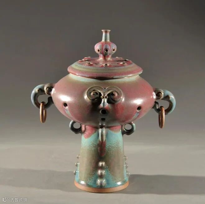 由中国工艺美术大事孔相卿设计的中秋作品《步步高》,以明月香薰为主体造型,香薰顶部出口为一只昂首向上的金蟾;金蟾为阴性,亦是月宫的象征,金蟾吐钱首尾呼应有富贵连连祝福绵绵之意。香薰底部有四环四孔寓意四面八方广纳百川。两端兔型耳饰,刻意夸大兔的长耳,写意而生动,下端装饰活环,平添灵动之气。整体造型简洁流畅,挺拔秀美,兔型耳饰飘逸大气,金蟾小巧精美。窑变釉色或如冰似玉或如艳丽云霞。满月的球体为钧釉流动很大表现空间,蓝、紫、红错综相间,天青似夜色,月白如流云。