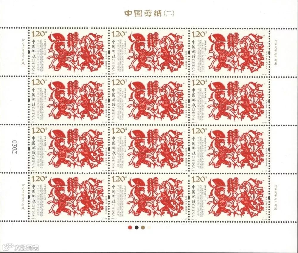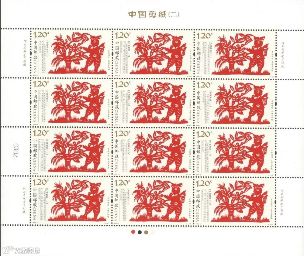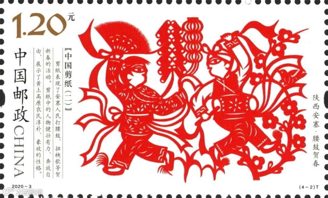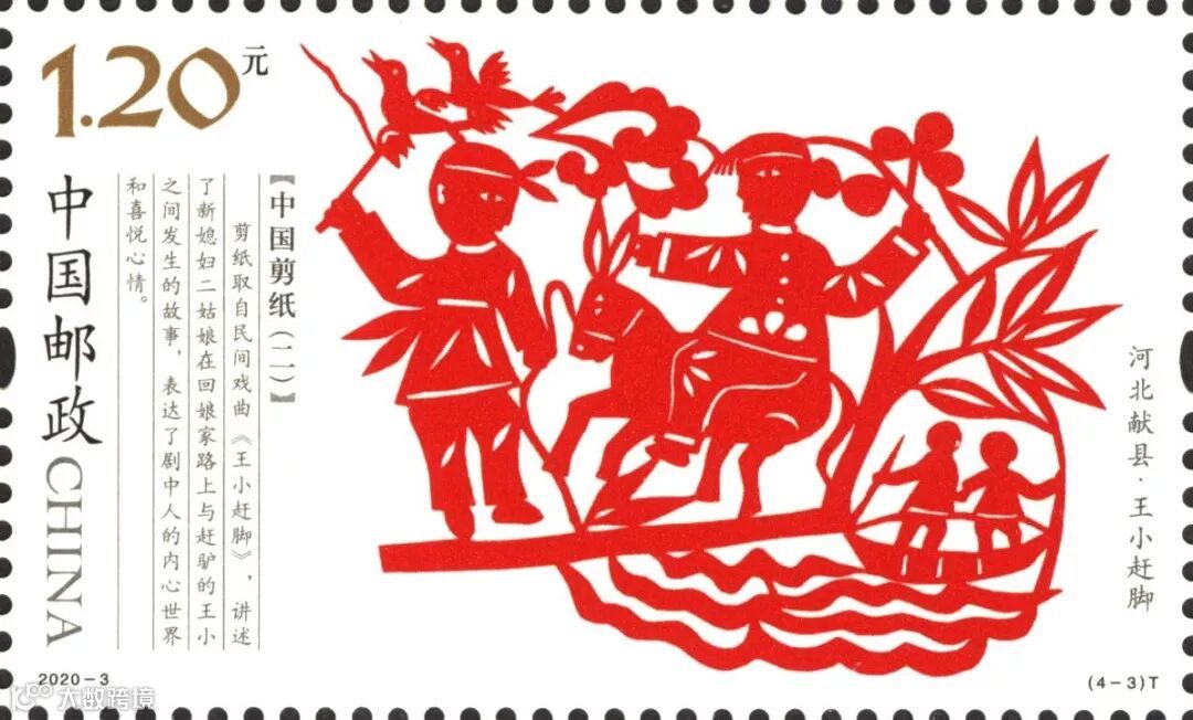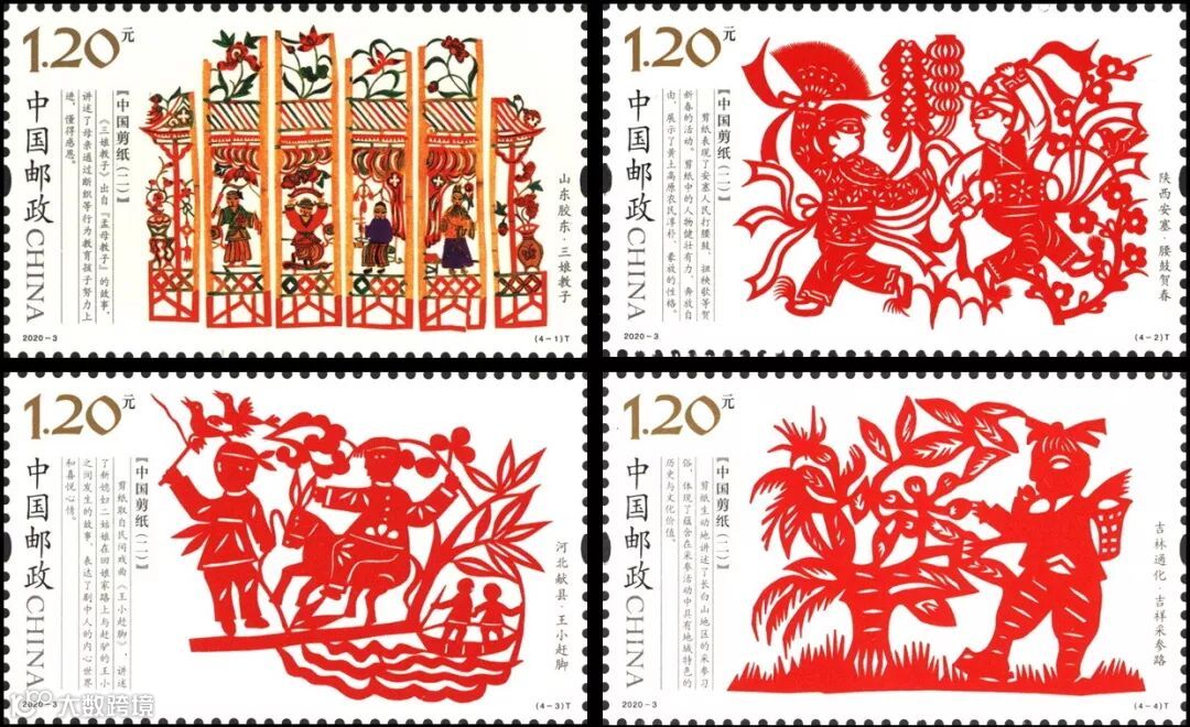 2020-3《中国剪纸(二)》特种邮票一套4枚,系“中国剪纸”系列邮票的第二组,表现了我国北方四种代表性剪纸。该套邮票由王虎鸣设计,河南省邮电印刷厂采用局部全息烫印工艺胶版印刷。