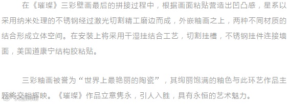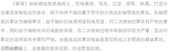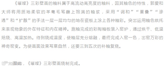 为了让釉画呈现出更好的艺术效果,郭爱和表示他们在工艺上也付出了不少努力。“作品的坯体是精陶素坯,由于釉料高透明性和高亮度的特点,对二次烧制的素坯白度有很高要求。”郭爱和说。