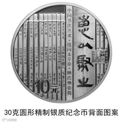30克圆形银质纪念币背面图案为战国末至秦睡虎地秦简局部文字及“惠以聚之”字样与“中国书法艺术”篆刻钤印等组合设计,并刊“中国书法艺术·战国末至秦·睡虎地秦简”字样及面额。