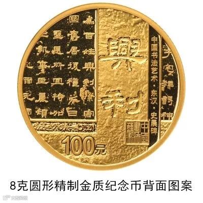 8克圆形金质纪念币背面图案为东汉史晨碑局部文字及其“兴利”字样与汉代画像砖纹饰、“中国书法艺术”篆刻钤印等组合设计,并刊“中国书法艺术·东汉·史晨碑”字样及面额。