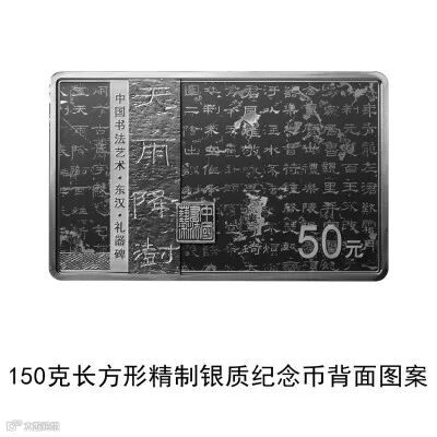 150克长方形银质纪念币背面图案为东汉礼器碑局部文字及其“天雨降澍”字样与汉代画像砖纹饰、“中国书法艺术”篆刻钤印等组合设计,并刊“中国书法艺术·东汉·礼器碑”字样及面额。