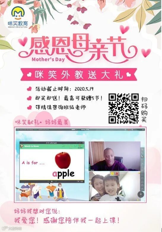 温馨五月,感恩的季节。母亲节当天,咪笑在线外教团队以“感恩母亲节”为主题开展了课堂教学,外教和孩子们一起将中华传统美德--“孝顺”植入到英语教学中,课堂气氛温馨,满满的爱意穿透了屏幕。