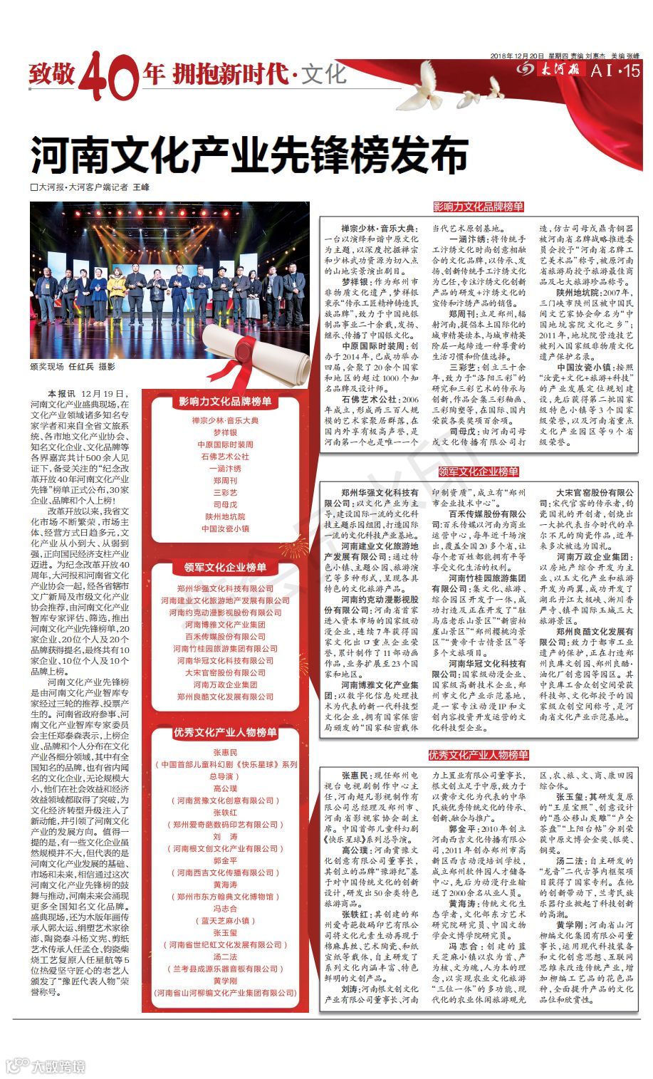 据报道,河南文化产业先锋榜单是为了纪念改革开放40周年,由大河报及河南省文化产业协会一起,经各省辖市文广新局及市级文化产业协会推荐,由河南文化产业智库专家评估后筛选出的在社会效益和经济效益方面都有新突破,为经济转型升级注入了新动能,引领了河南文化产业发展方向的品牌、企业和个人。
