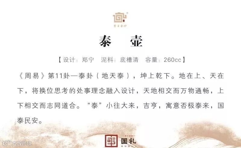 万物顺遂和畅即是泰,《易》中乾上坤下谓之“泰”,坤者地也,地者方也;乾者天也,天者圆也。天圆地方乃为道,天下地上则为象。天地两融换位寓意沟通,沟通了才有雾雨雷电,才有春夏秋冬,才有繁花硕果。“泰”,道正象吉,于国家有国泰民安,于家庭有三阳开泰,于个人有否极泰来。泰壶,是不忘初心,是对美好未来的憧憬和寄托。