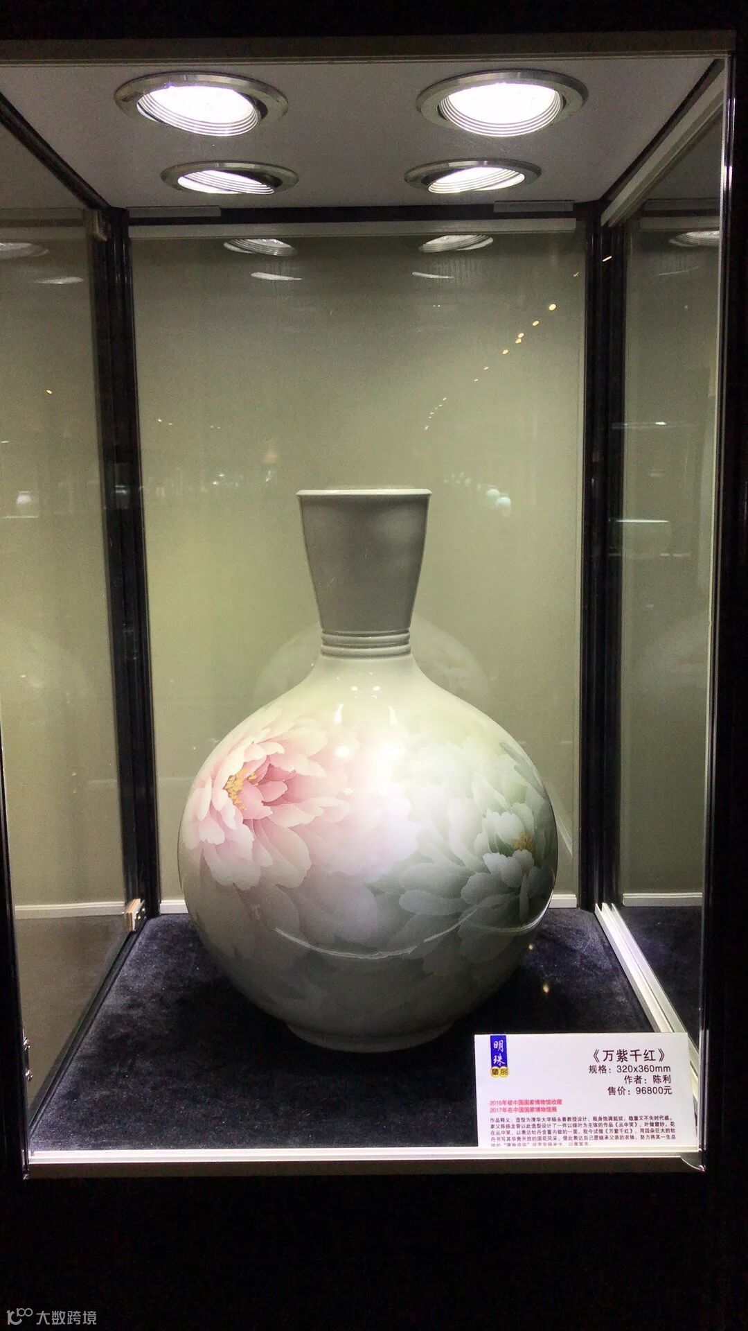 作品造型为清华大学杨永善教授设计,瓶身饱满挺拔,稳重又不失时代感。家父陈扬龙曾以此造型设计了一件以绿叶为主体的作品《丛中笑》,叶做窗纱,花在丛中笑,以表达牡丹含蓄内敛的精神世界。我今试做《万紫千红》,用四朵巨大的牡丹书写其华贵开放的国花风采,借此表达自己愿继承父亲的衣钵,努力将其一生总结的“薄施淡染”技艺发扬光大,以孝其志。