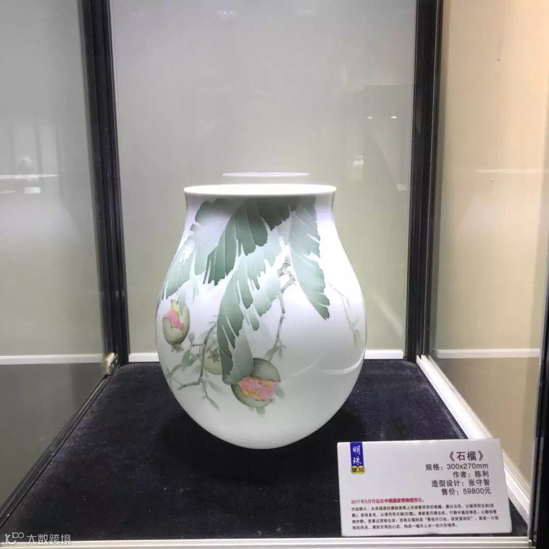 水灵通透的薄胎瓷瓶上洋溢着浓浓的笔趣:墨分五色,以破用而生韵(芭蕉);彩有多色,以清用而无痕(石榴)。清新里巧得生机,宁静中蕴含禅思。心静闲看物亦静,芭蕉过雨绿生凉;而熟石榴则是“看他开口处,谈笑落珠玑”,真是一片明丽的风采,满腔乐观的心态,构成一幅天人合一的大和境界。
