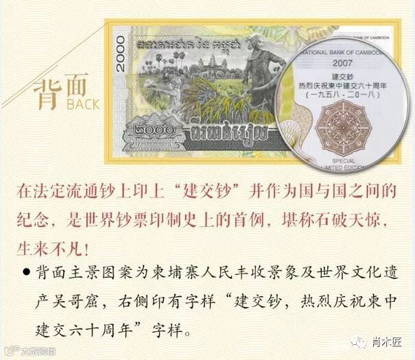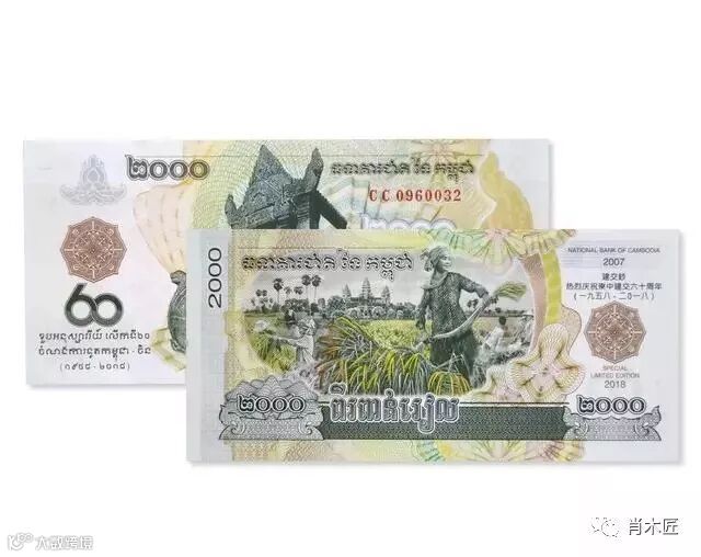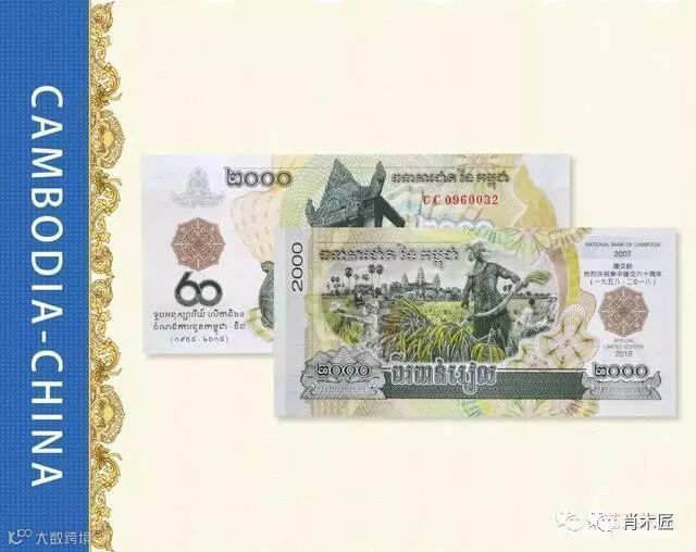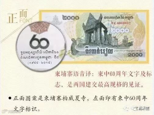 2018年作为中柬建交60周年重大事件,柬埔寨王国特批柬中央银行发行迄今为止首枚纪念钞。是新中国69年外交史上、178个建交国里,首次由外国发行建交纪念钞,数十年一遇的“建”字头龙头钞,意义重大!钞票正面图案为世界文化遗产——柏威夏寺,背面图案为人民丰收景象及世文化遗产吴哥窑。票面面值2000瑞尔/张,票幅长为147*68毫米。