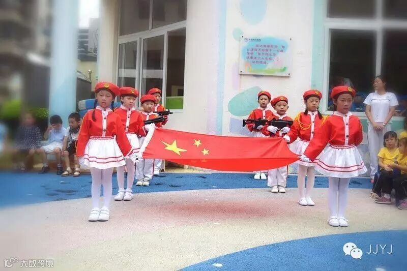 在小主持们及园长妈妈真挚的节日祝愿后,紧接着四位护旗手和两位升旗手的簇拥着鲜红的五星红旗,迈着整齐的步伐进场,全场小朋友庄严地行注目礼,孩子们伴随着乐曲唱起嘹亮的国歌,国旗随着激昂奋进的国歌声冉冉升起,孩子们对祖国妈妈的敬爱之情油然而生!