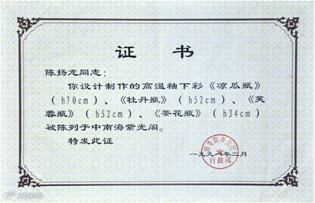 1994年 《芙蓉花缸》《蝴蝶海棠》获第五届全国陶瓷艺术设计创新评比优秀奖。
