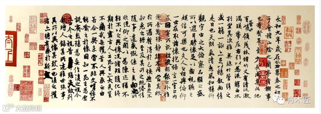 有“书圣”之称的王羲之,是东晋时期著名书法家,在书法史上,他与其子王献之合称为“二王”。其书法兼善隶、草、楷、行各体,冶于一炉,摆脱了汉魏笔风,自成一家,影响深远。风格平和自然,笔势委婉含蓄,遒美健秀。代表作《兰亭序》被誉为“天下第一行书”。以沈绣来表现这一“天下第一行书”,实在让人叹为观止。