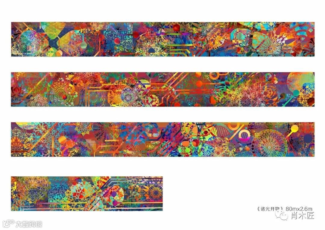 《诸光开物》——“各种智慧之光开示下,通晓万物的道理”,以世界性的语言,中性的装饰性图案以及国家会展中心综合体四叶草建筑形态贯穿其中,地铁十七号线第二站位于青浦区诸光路,作品取名诸光开物,即彰显国家会展中心的区位地标,也立意隽永,引人入胜,具有永恒的艺术魅力。
