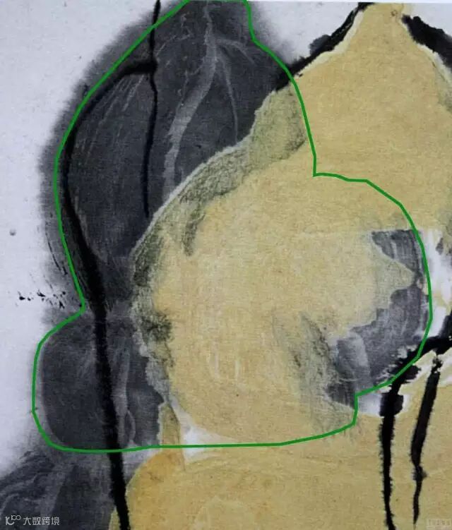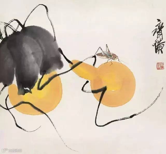 即使是画了一辈子的东西,信手画来,还是因为神志恍惚而出错。点了黄颜色画葫芦,这没错,一大一小,一前一后,一上一下,但用淡墨画叶子时恍惚了,画成了葫芦的样子,而且居然从大葫芦留白的地方冒出两笔淡墨,好像这葫芦穿了个洞。