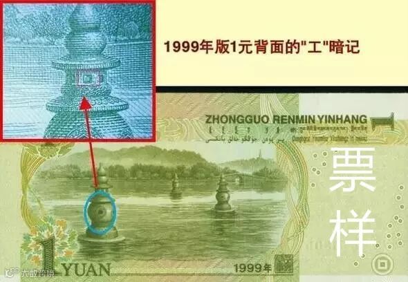 第五套人民币1999年版1元背面的暗记:“工”,但对这个暗记持保留态度,因为笔画太过于简单,说是暗记有点牵强。