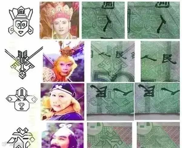 第五套人民币50元钞票中发现脸谱,出现了唐僧师徒4人的脸谱,不过如果没有指引,恐怕很难发现。