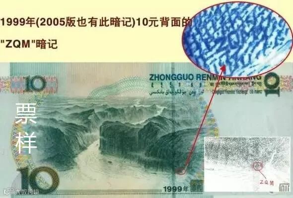 在99版及05版10元背面瞿塘峡图右侧山崖小溪左下部,即年号1999年上方约8毫米处发现有“ZQM”三个英文字母暗记。