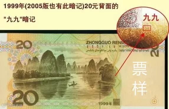 在20元背面右边灌木中有“九九”字样,甚至用肉眼仔细看还可看出,放大效果如上图。