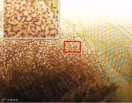 第五套人民币100元券上既存在胶印缩微文字也存在凹印缩微文字。图中胶印底纹中大量存在“RMB100”字样的胶印缩微文字。
