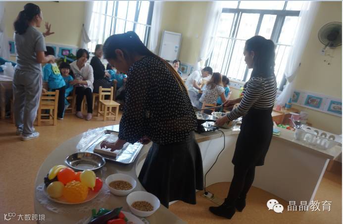 同样,中班小朋友在《魔力种籽》主题探究中,来到了幼儿园的生活操作坊,探索有关黄豆的豆制品制作过程,活动当天,还邀请了二位妈妈通过有关黄豆的制品,为我们烹饪出美味可口的豆桨、香煎豆腐和炒豆芽。