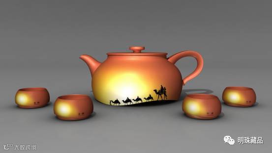 壶底和杯底均采用流畅的曲线,代表大海的波浪和沿途的沙漠,行走的骆驼,运来了财富,此画面不禁让人想起了曾经的“陆上丝绸之路”。壶背面的现代建筑,所呈现的是一座座沿途各国的现代景象,新的“一带一路”。帆船代表的是“海上丝绸之路”,寓意一帆风顺。
