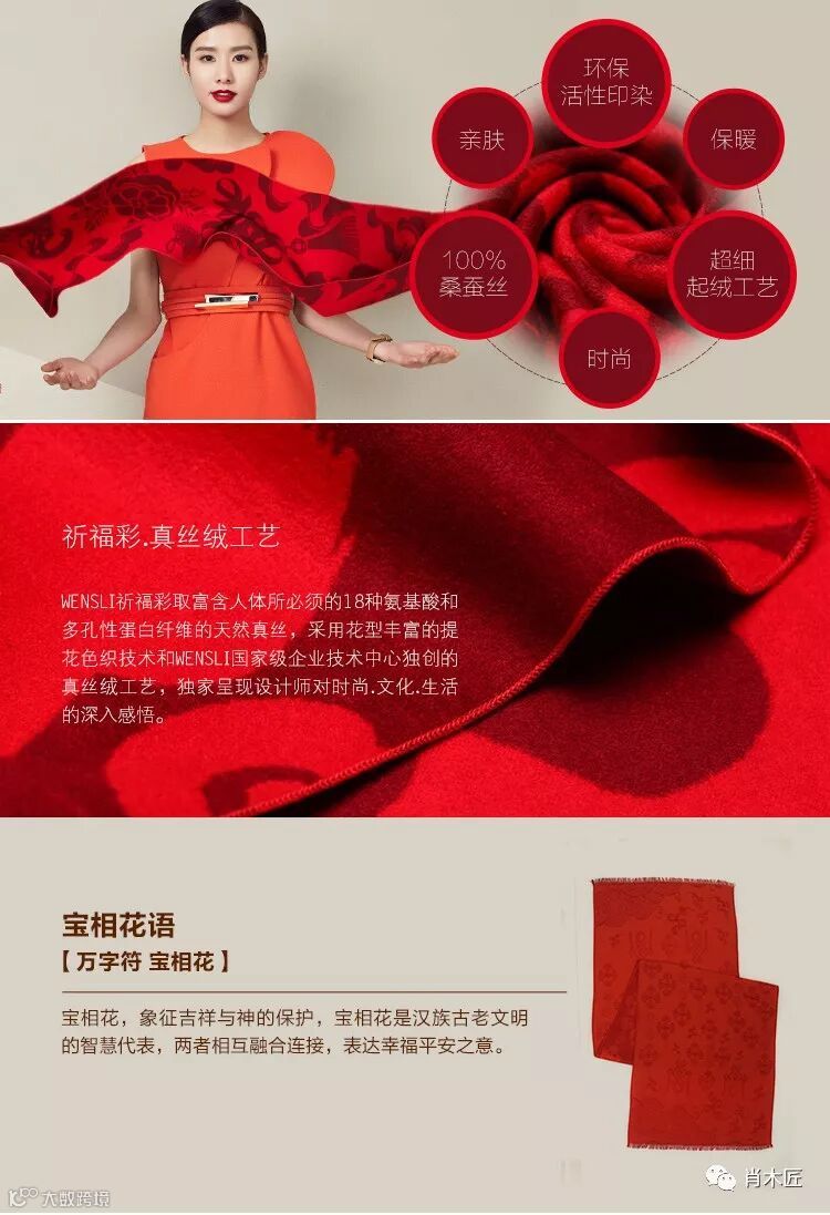 这条围巾名为“万事利祈福彩”!“彩”愿意是指多种颜色的丝绸聚集在一起,在中国传统文化中,是好运,幸福的象征。如彩头,精彩,多彩,中彩等。“祈福”意指用某种方式表达自己的祝福方式。