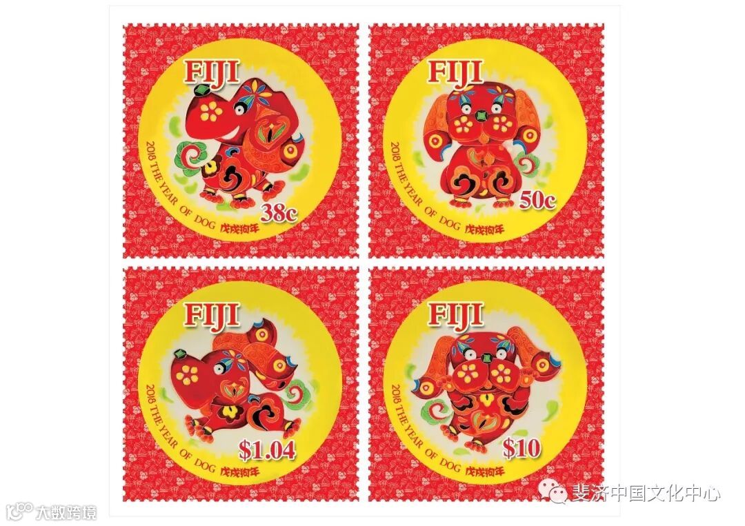 斐济共和国2018“中国狗年生肖邮票”《福旺祥余》由国家文化部优秀专家、中国陶瓷艺术大师、中国陶瓷设计艺术大师、中国三彩艺术馆馆长郭爱和设计,以华人民俗狗为设计题材,融合吉祥、富贵、平安、有余等元素。采用方圆邮票形式,契合中国天圆地方的哲学理念,中国与斐济“天涯若比邻”。在邮票的红色底纹上,斐济国旗国徽上的元素以及国花“扶桑”遍布其上,叼着橄榄枝的鸽子象征和平,甘蔗、椰子、香蕉象征农作物在国民经济中的重要性,帆船,象征这个国家位于南太平洋和古老的交通工具。