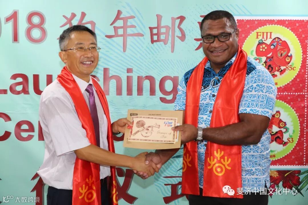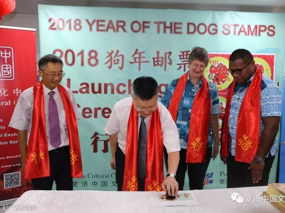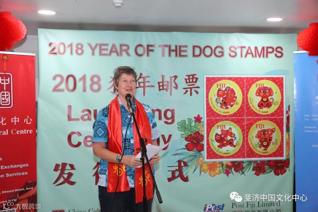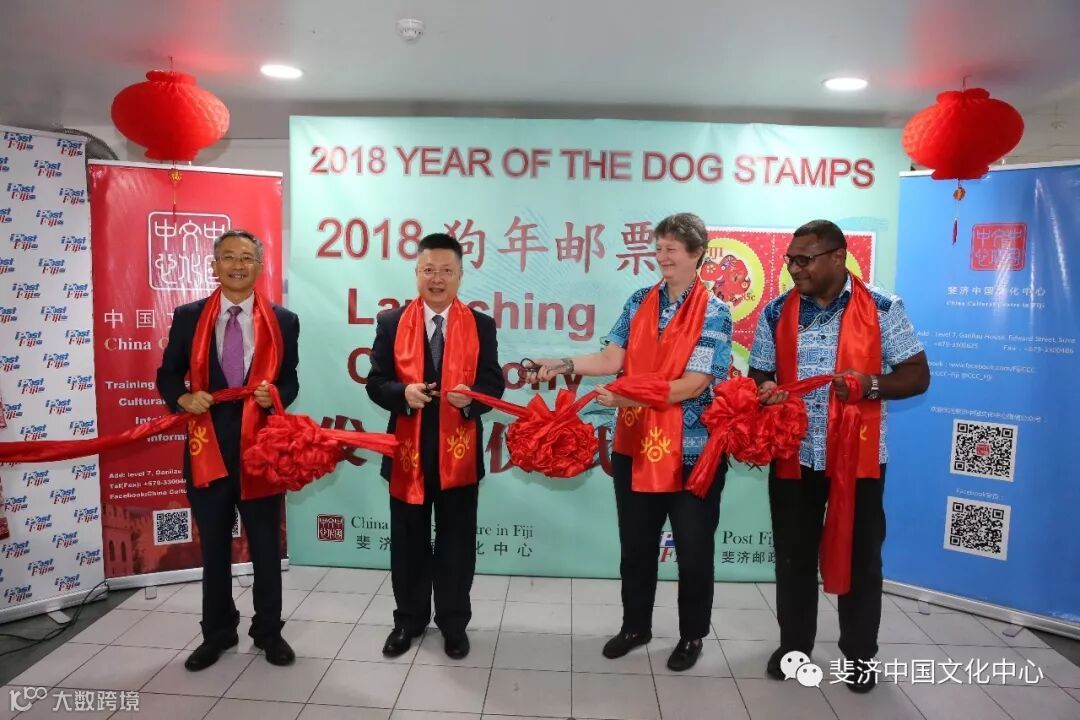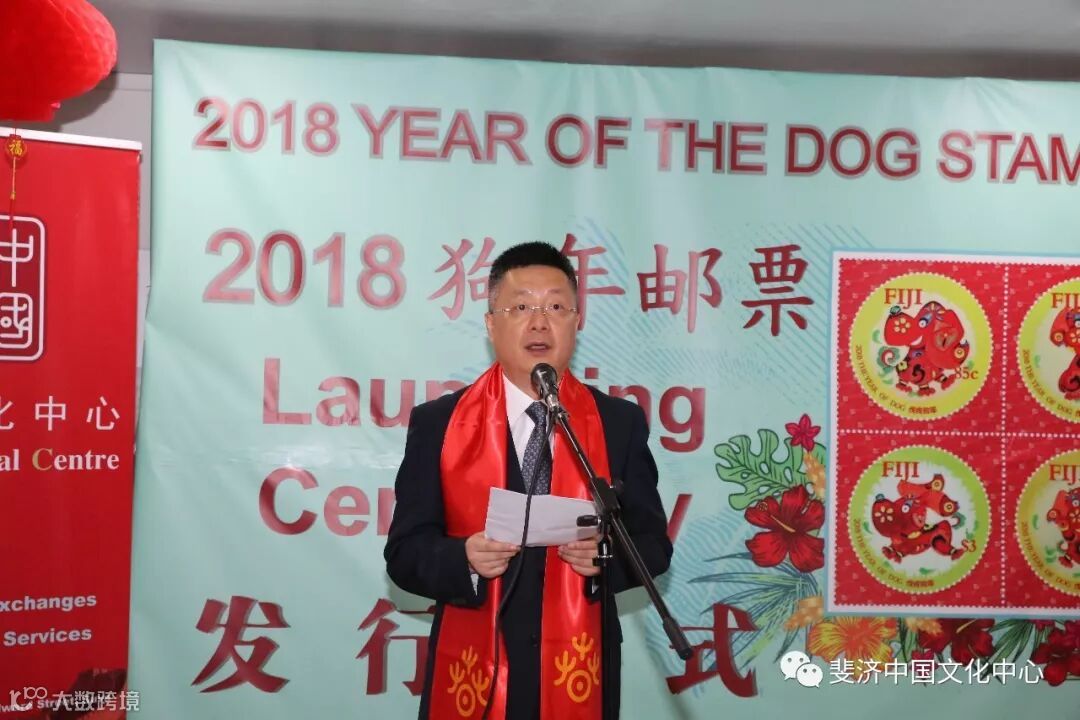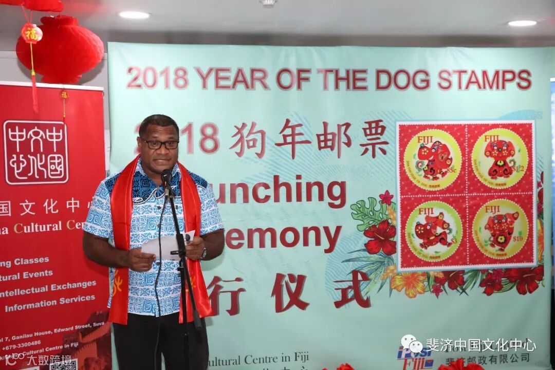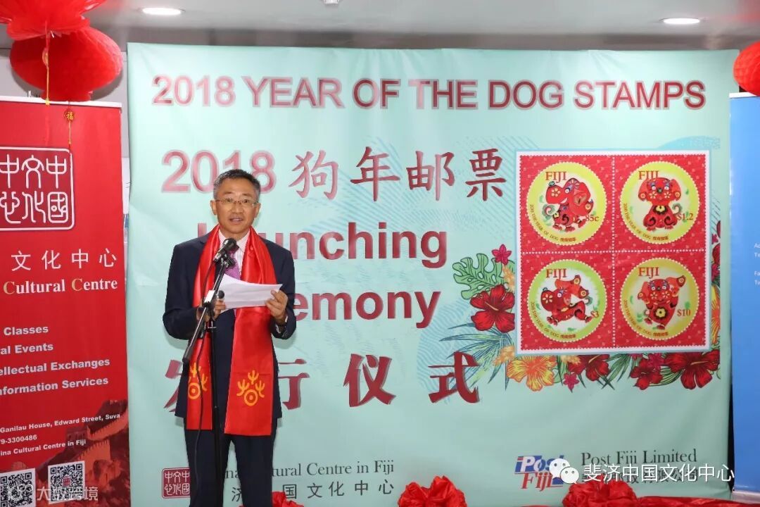 由斐济中国文化中心和斐济邮政有限公司联合推出的2018狗年生肖邮票发行仪式,于3月2日中国农历新年元宵节在斐济邮政总局成功举办。中国驻斐济大使钱波, 斐济教育、遗产与艺术部常秘(副部长)阿莉森.伯切尔, 斐济邮政有限公司代理首席执行官艾萨克.茂, 斐济中国文化中心主任邓先富等中外嘉宾出席仪式并分别致辞。斐济旅游劳工部前部长以及斐济教育遗产艺术部、斐济艺术委员会、斐中友好协会、斐济邮政有限公司、当地华人华侨、当地媒体等组织和机构的代表60余人参加了发行仪式。