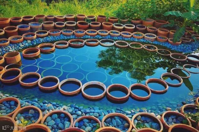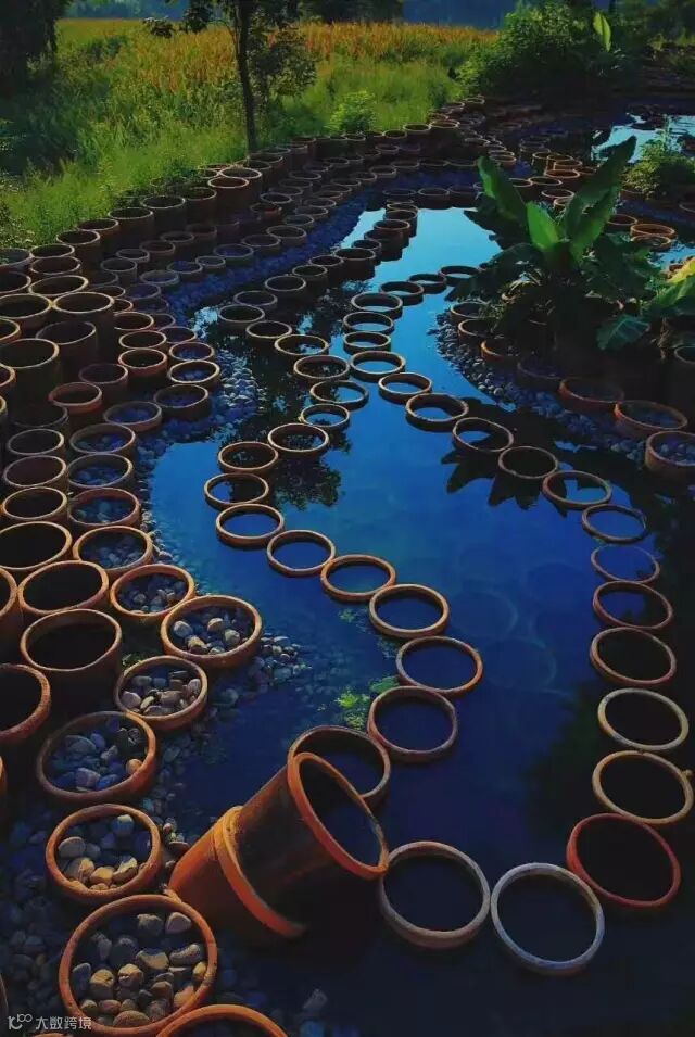 洛阳三彩(国际)陶艺村(爱和小镇)的装置水景作品:《容》。海纳百川,有容乃大,一切都是“缸缸好”。