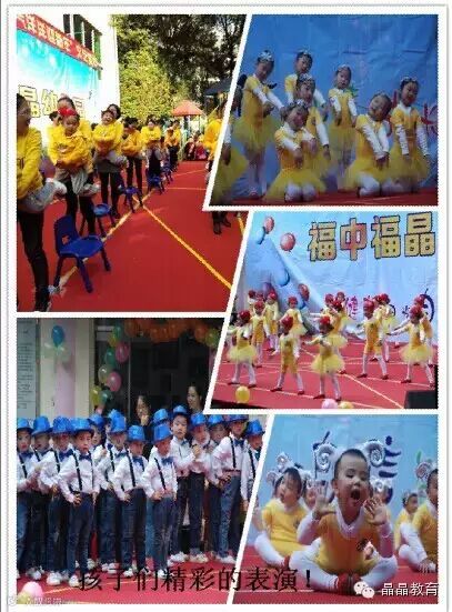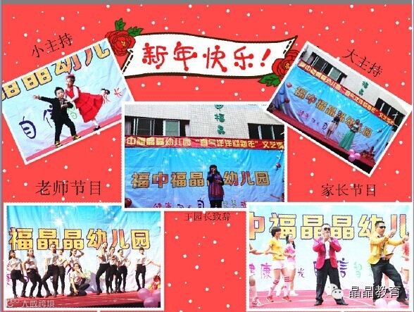 2014年12月31日上午,福中福晶晶幼儿园组织了一场精彩纷呈的文艺演出活动。这次文艺演出以“喜气洋洋迎新年”为主题,全园300余名幼儿、家委会成员、部分年轻教师联袂上演,小班孩子童趣十足的表情、中大班孩子优美而深情的表演得到观众们热烈的称赞,家委会成员集体表演的《我的小苹果》,诙谐有趣的动作,引来家长们一阵阵掌声,而老师们精美的舞蹈形象带给所有观众美的感受和熏陶。