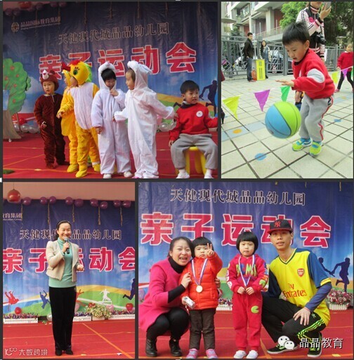 现代城晶晶幼儿园的亲子运动会以“我运动、我健康、我快乐”为主题,整个活动分为两部分,第一部分是亲子才艺展示,第二部分是亲子运动项目竞赛。亲子运动项目包括 “家长拔河比赛”“20米快跑”、“立定跳远”、“拍球”、“投掷”等。