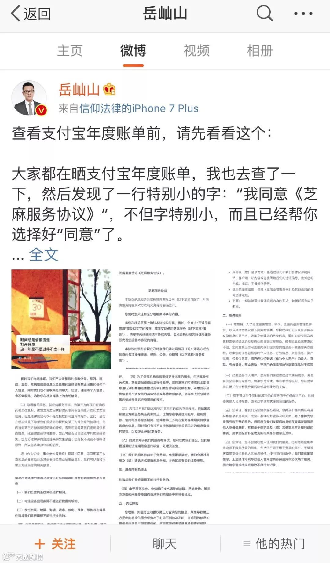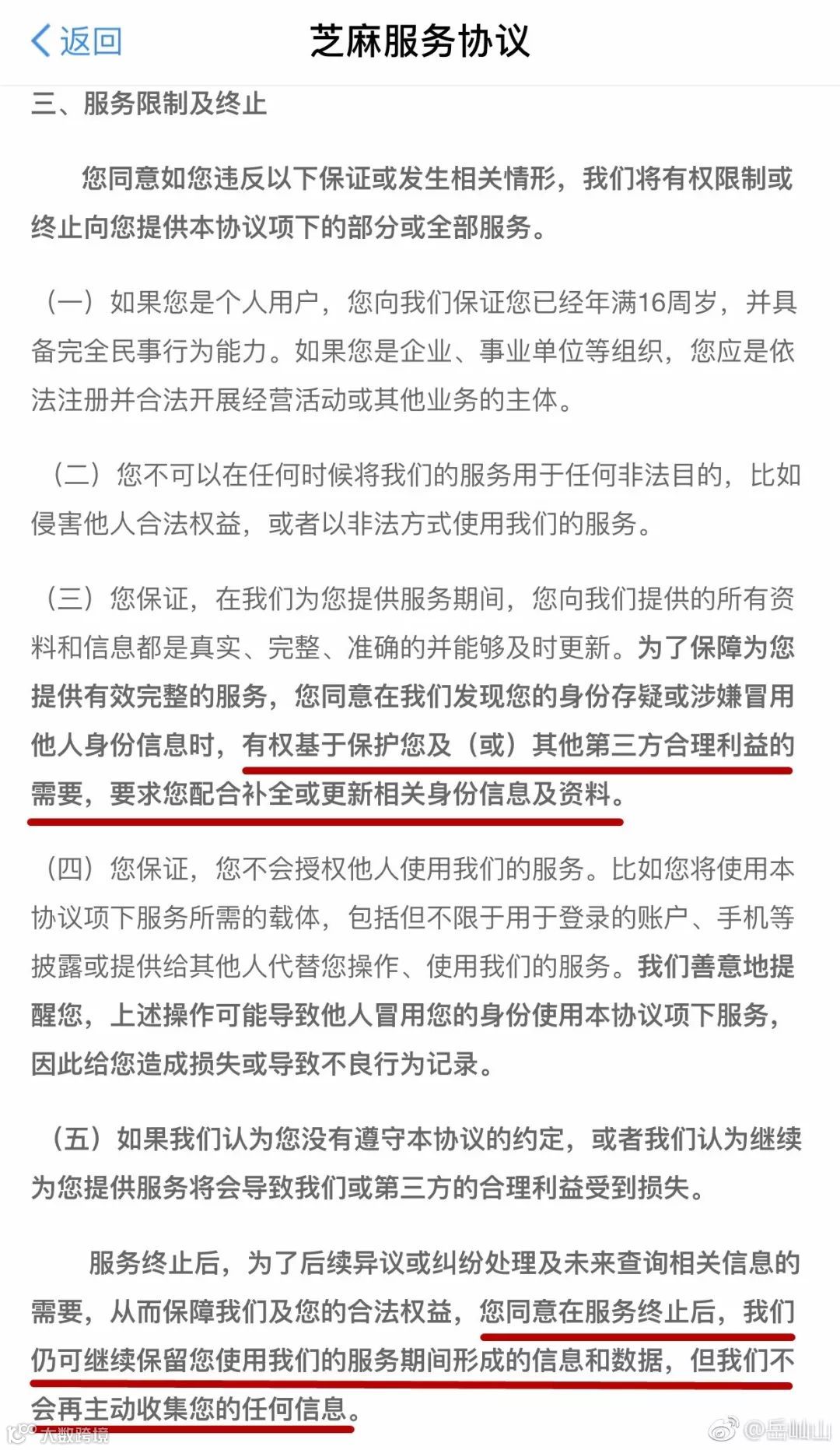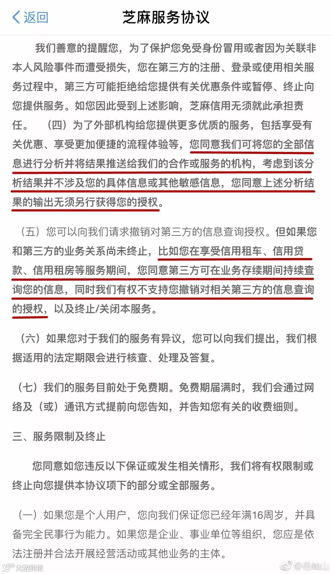 岳屾山在微博中说,根据《互联网交易管理办法》的规定,经营者应当采用显著的方式提请消费者注意与消费者有重大利害关系的条款。同时对于信息收集,该规定要求经营者需要明示收集、使用信息的目的、方式和范围,并经被收集者同意。而“芝麻”这个根本不给你了解条款的机会,直接让你默认同意,稍不注意就进坑了。