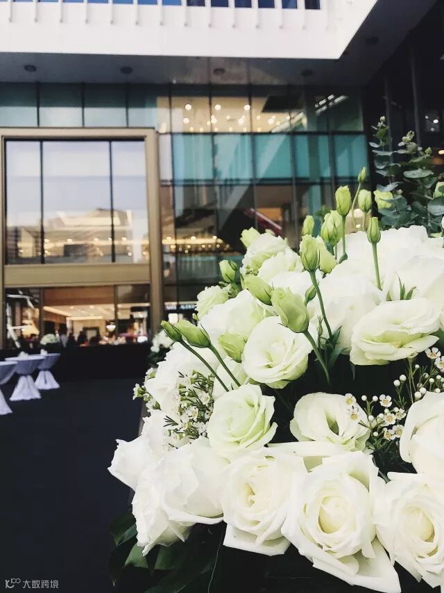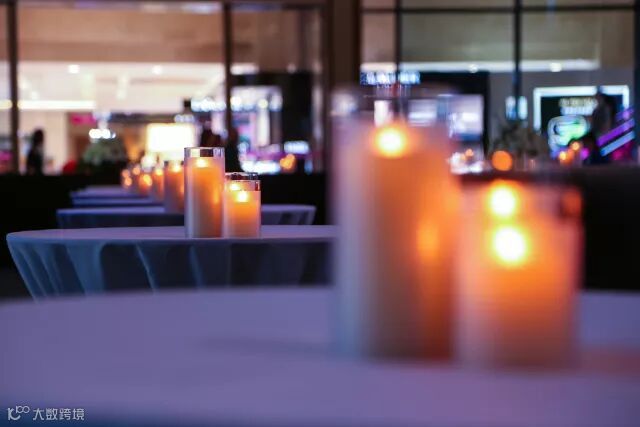 桔梗和玫瑰组成清雅花卉,跃动的烛光摇曳着腰肢,堆积的纯白方体染上淡彩,在地面投影下梦幻的倒影。