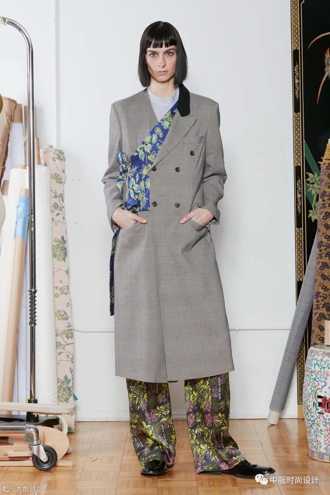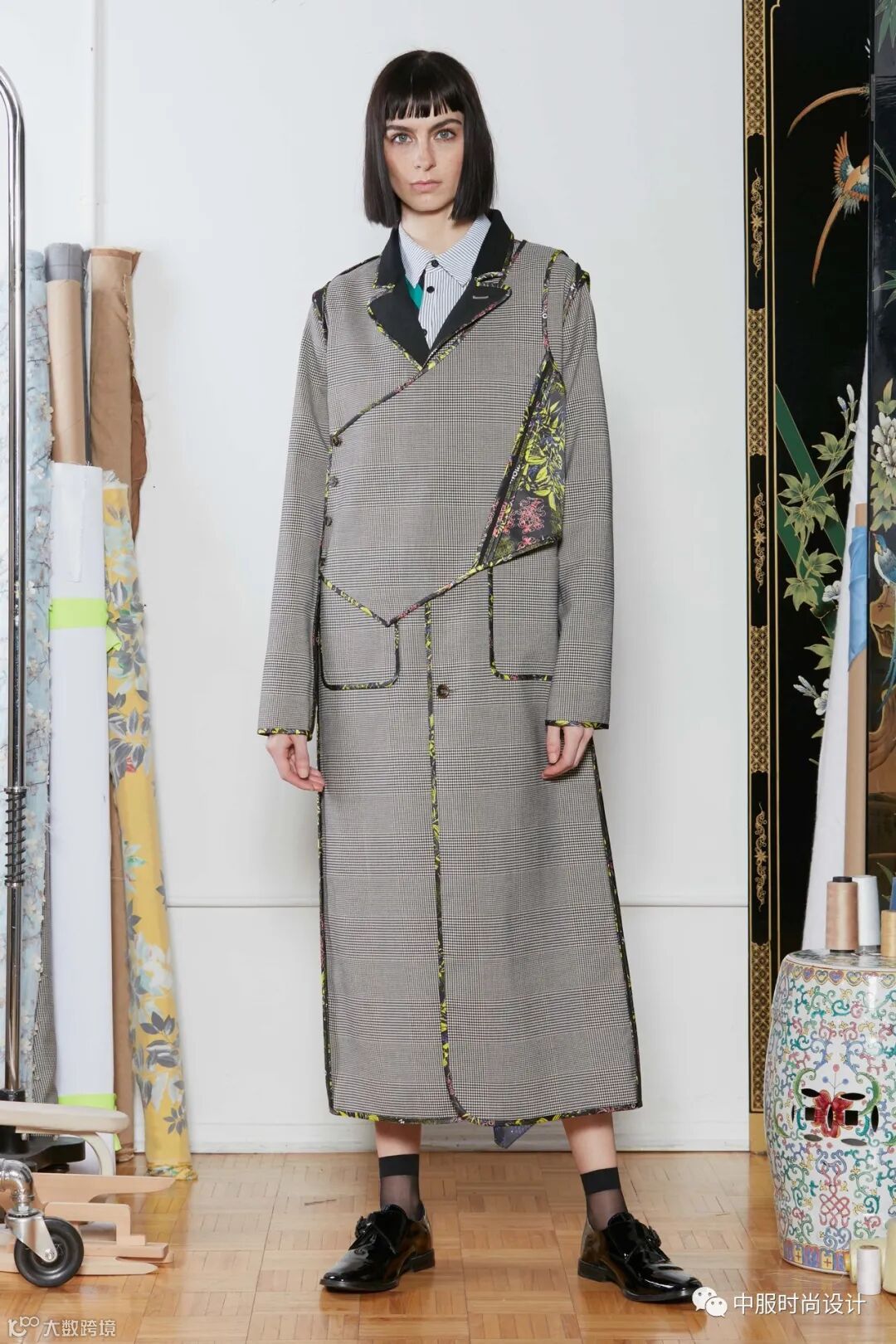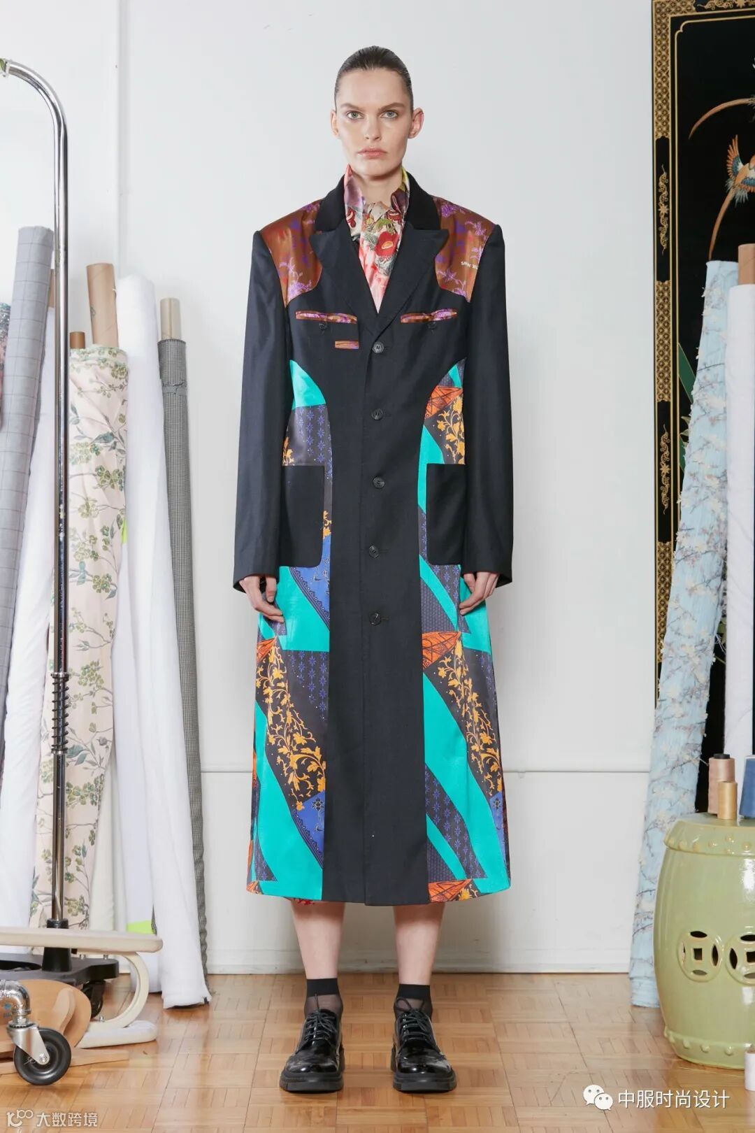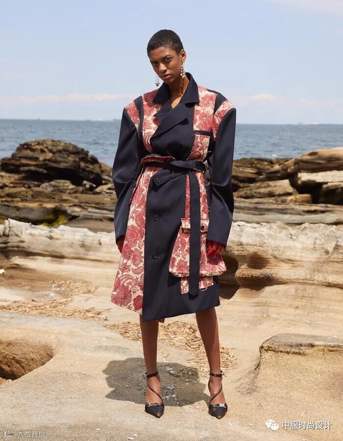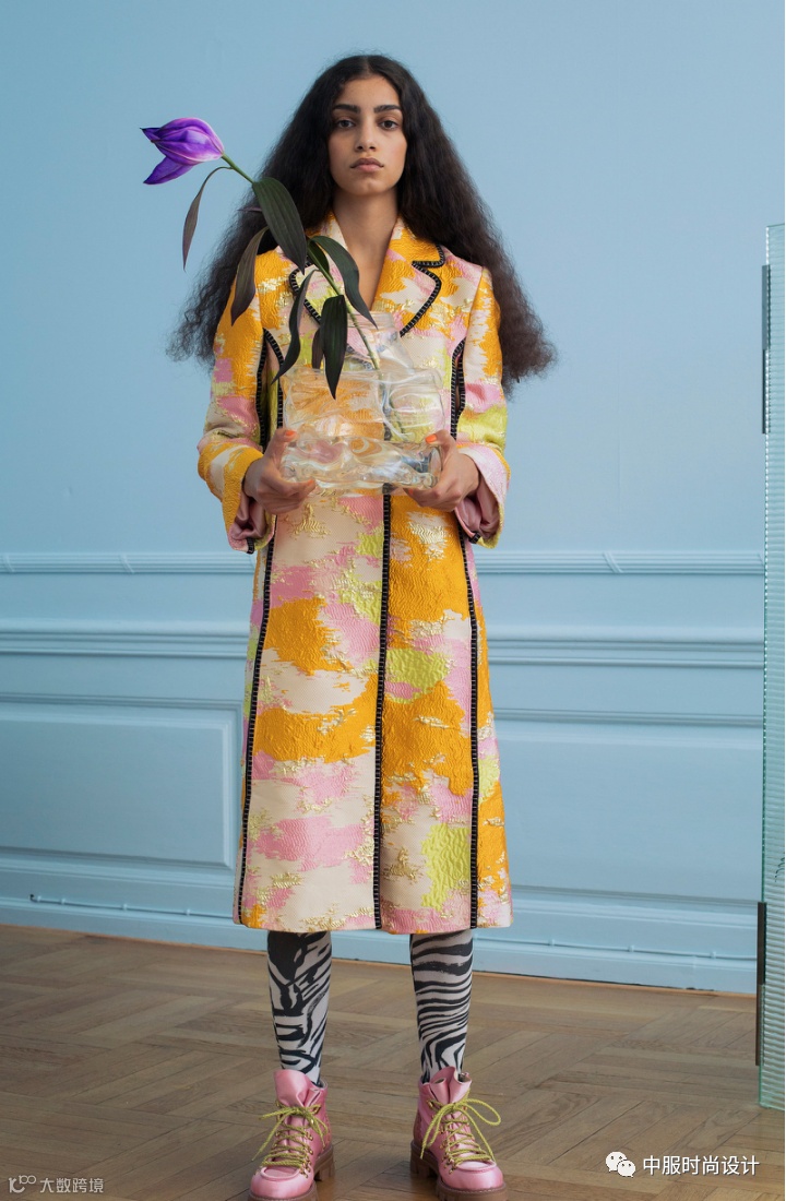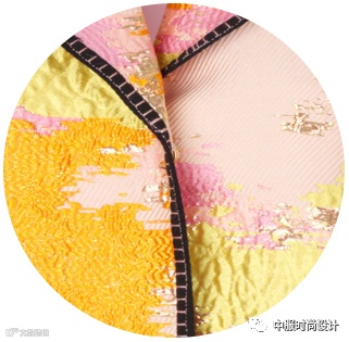 运用皮革、丝绒、色丁等材质镶嵌在不相同色系的不同面料上一直是装饰设计手法。新一季采用花色异色包边产生视觉美,大胆的撞色边缘包边工艺,增加了服装单品的空间层次感,从而达到精致考究的装饰效果。