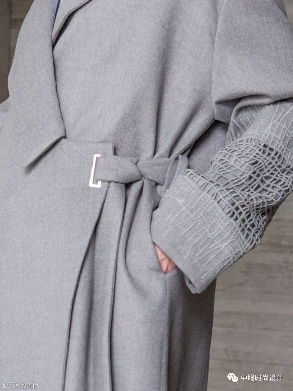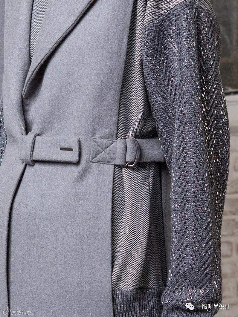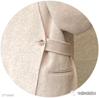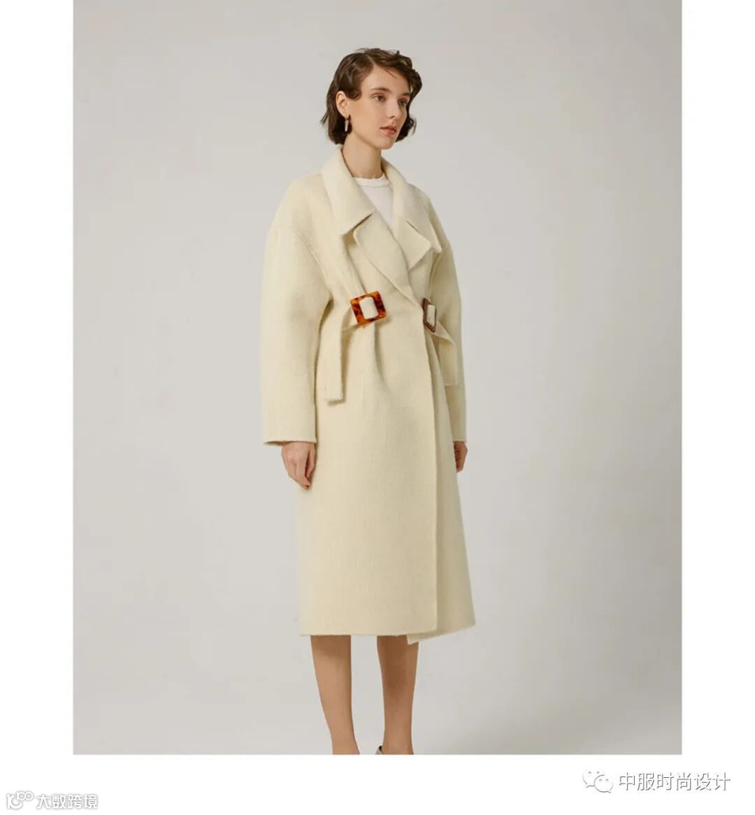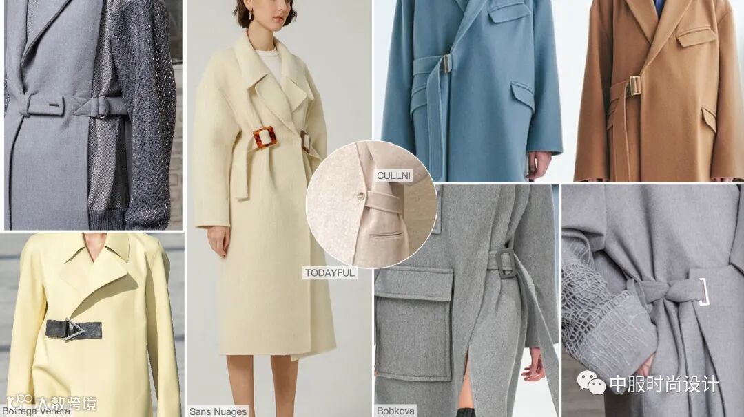 侧边袢带装饰在大衣侧腰部起到收腰的功能,同时达到装饰效果。结合造型多变的日字扣可调节设计,提升了大衣的灵活度与变化性, 同时袢带细节是当下火热的工装风元素,且是市场上受到消费者喜爱的上升趋势点之一。袢带的功能性在于可根据需求调节尺寸,同时展现了对身材的良好包容性。