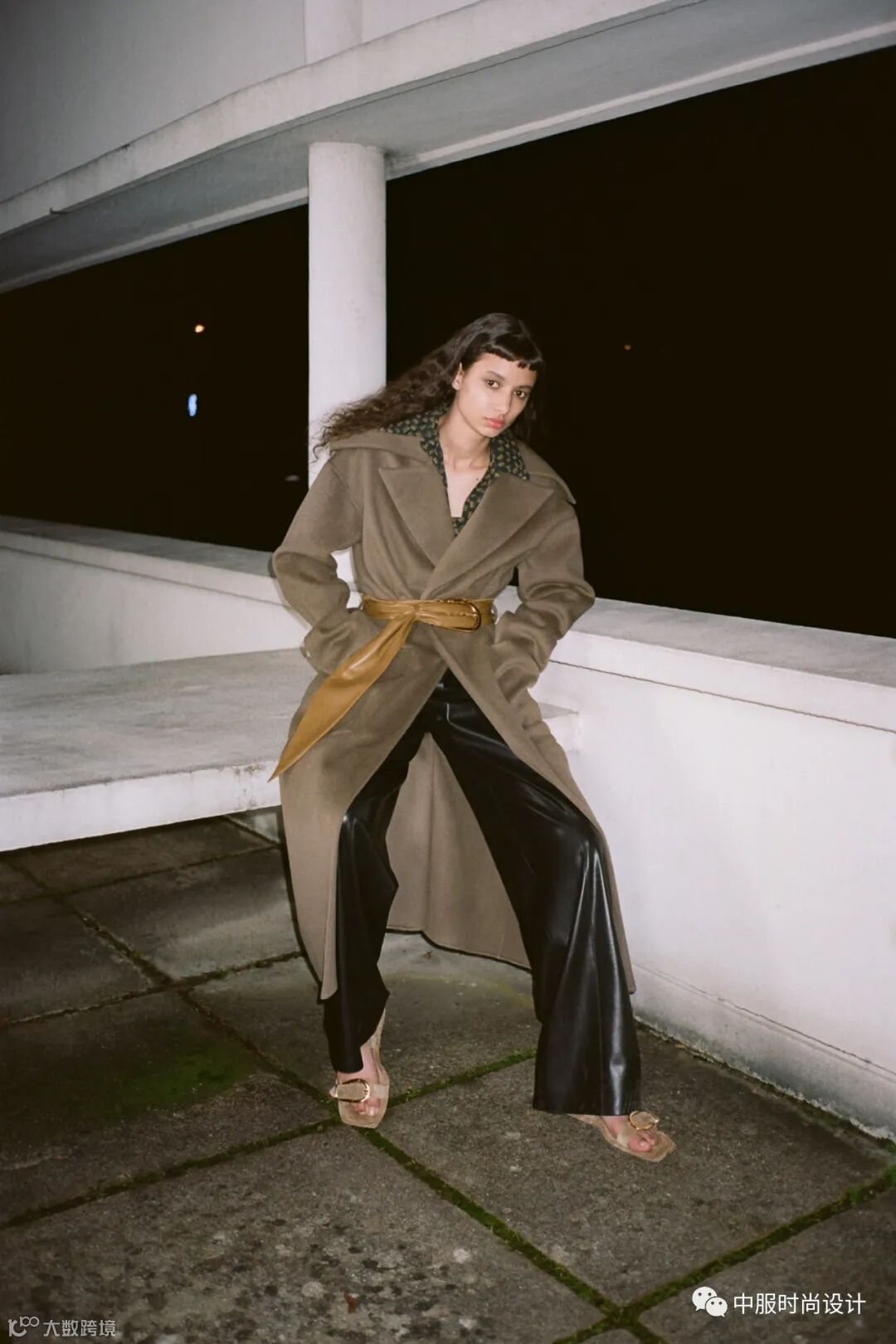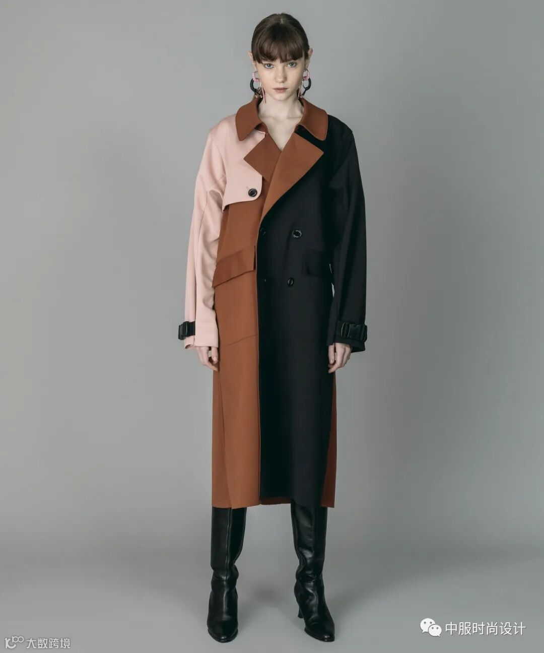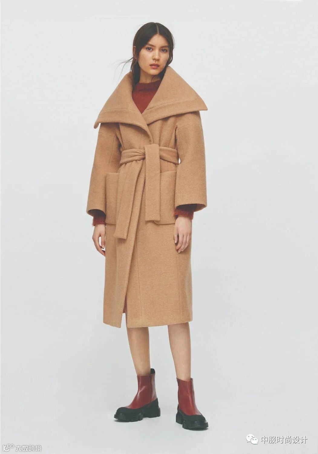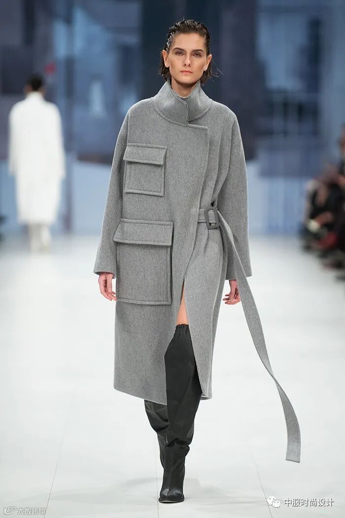侧边袢带装饰在大衣侧腰部起到收腰的功能,同时达到装饰效果。结合造型多变的日字扣可调节设计,提升了大衣的灵活度与变化性, 同时袢带细节是当下火热的工装风元素,且是市场上受到消费者喜爱的上升趋势点之一。袢带的功能性在于可根据需求调节尺寸,同时展现了对身材的良好包容性。
