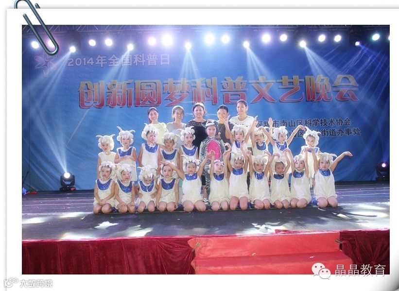 9月23日晚7:30在深圳市南山区文体中心举办了一场创新圆梦科普文艺晚会。晶晶汇金艺术幼儿园的节目《喜羊羊与灰太郎》代表南头街道办参演。