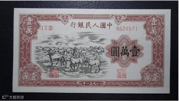 “牧马图”指的是第一套人民币中的壹万圆牧马券,票面左侧为牧马图,发行于1951年5月17日,1955年4月1日停止流通。在第一套人民币中价格最高,约为第一套大全套价格的50%左右。