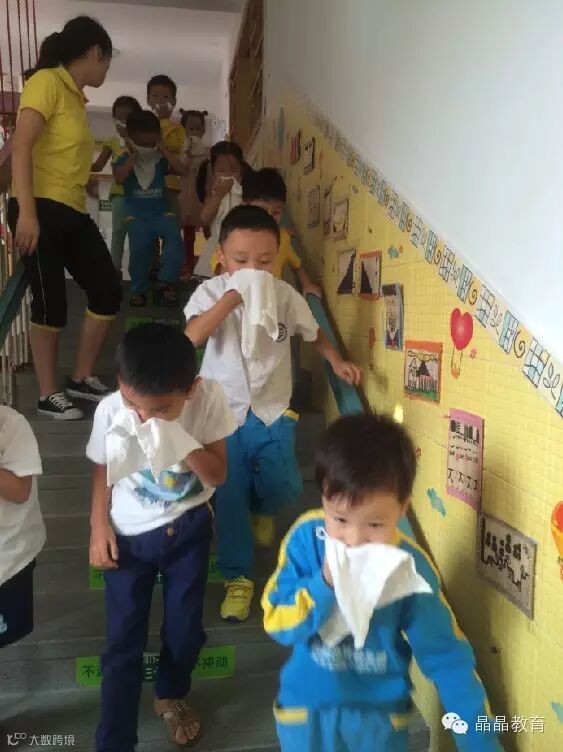 演练活动开始,警报声响起,各班老师带领幼儿迅速取下各自浸湿的小毛巾,捂住口鼻,弯下身子迅速撤离活动室;然后,在老师的指挥和带领下,按照安全疏通路线迅速有序的跑向楼梯;最后,通过三个安全出口,全体人员集合到空旷的操场上,清点人数。演练活动历时2分钟,全部完毕。