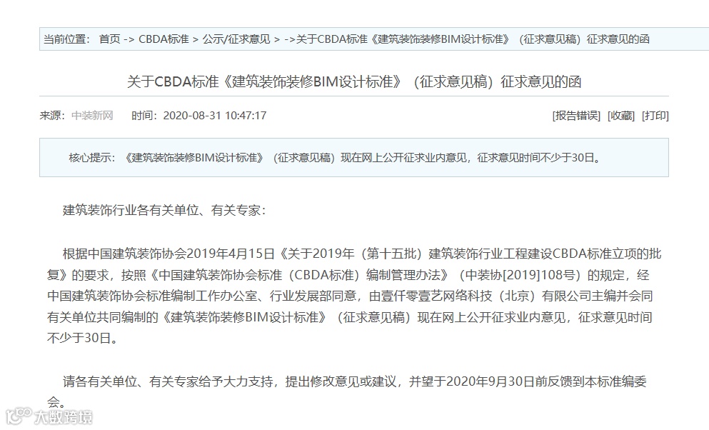 关于CBDA标准《建筑装饰装修BIM设计标准》(征求意见稿)征求意见的函