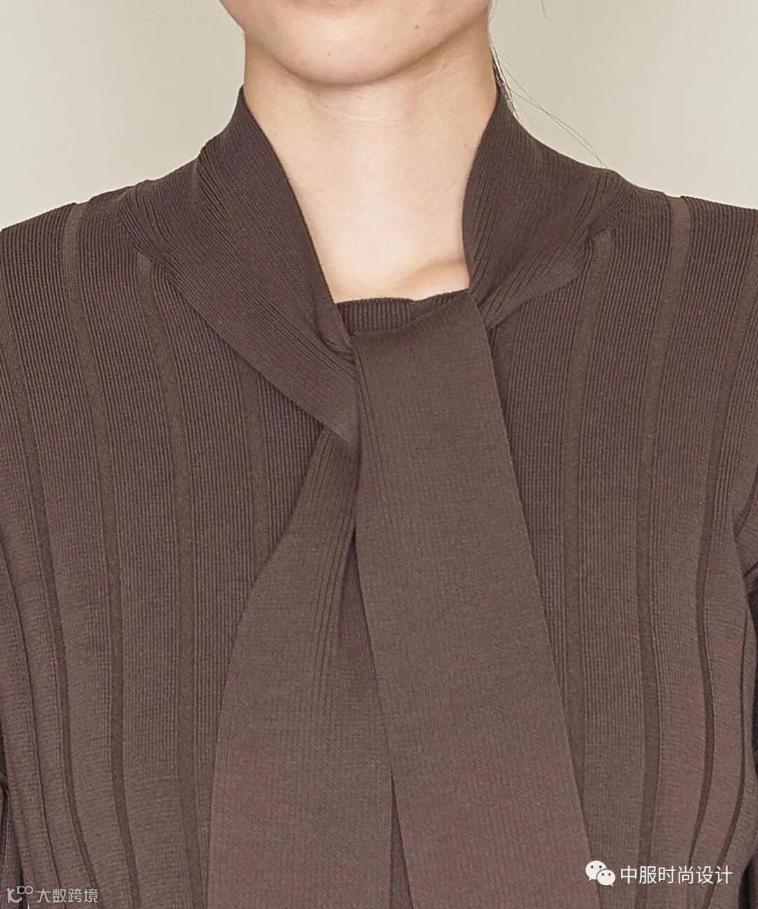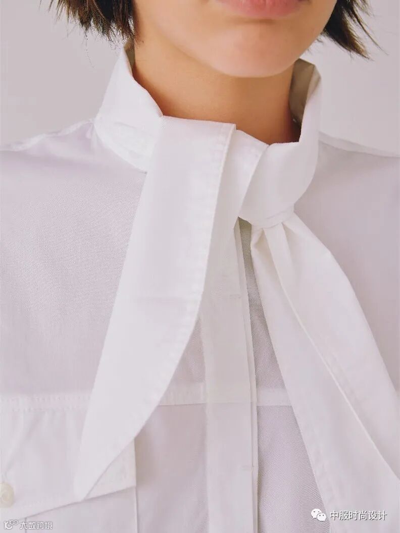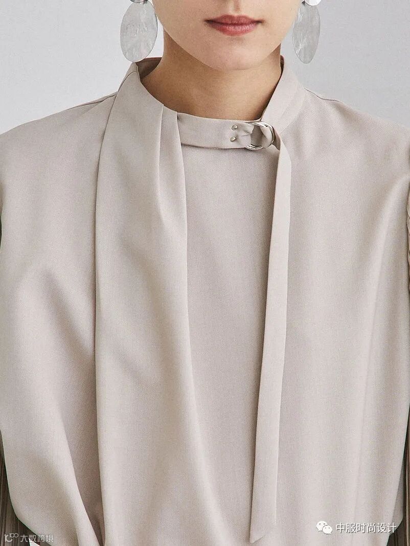 宽窄不一的织带将视觉中心聚焦于领部。织带之间交叉相连形成镂空突出女性颈部线条,亦可增加葱丝、亮片、钉珠等进行装饰提升款式整体精致度。长长的织带在领部系结拉长视觉比例的同时也给人领部包裹的温暖感受。
