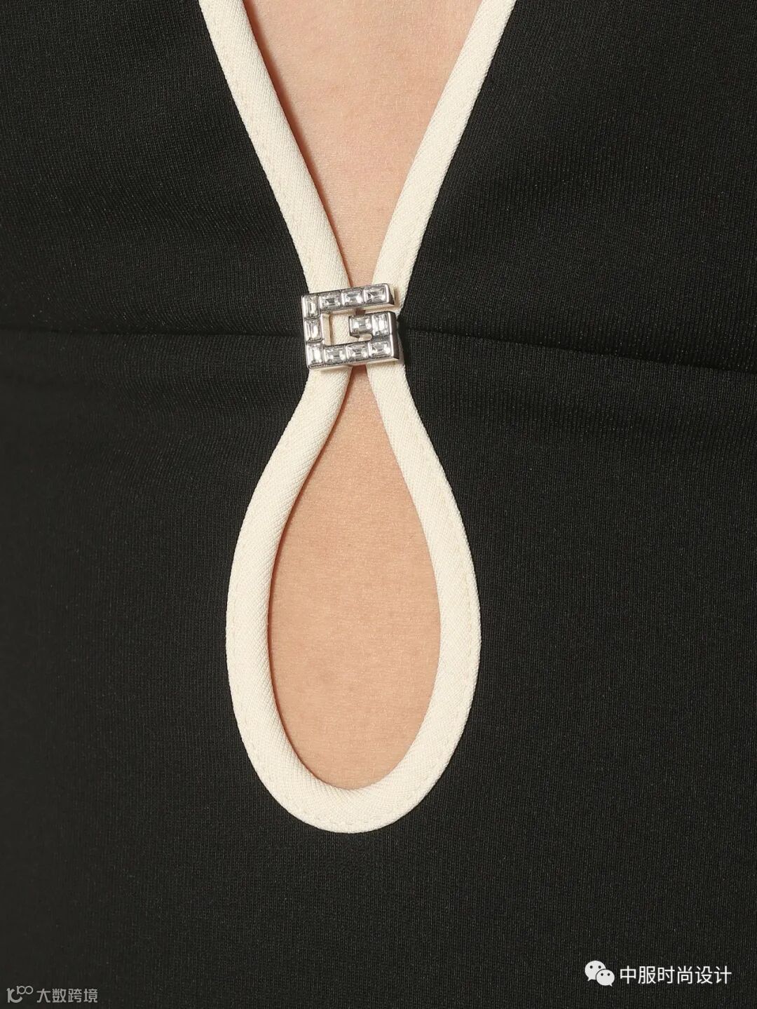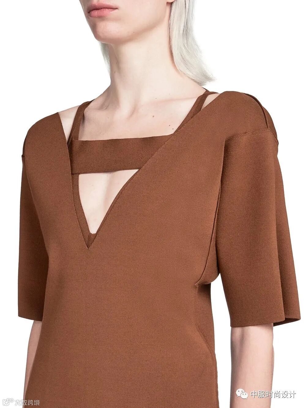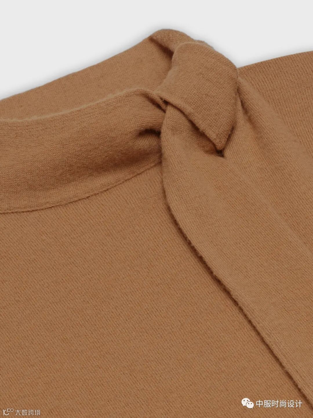 宽窄不一的织带将视觉中心聚焦于领部。织带之间交叉相连形成镂空突出女性颈部线条,亦可增加葱丝、亮片、钉珠等进行装饰提升款式整体精致度。长长的织带在领部系结拉长视觉比例的同时也给人领部包裹的温暖感受。
