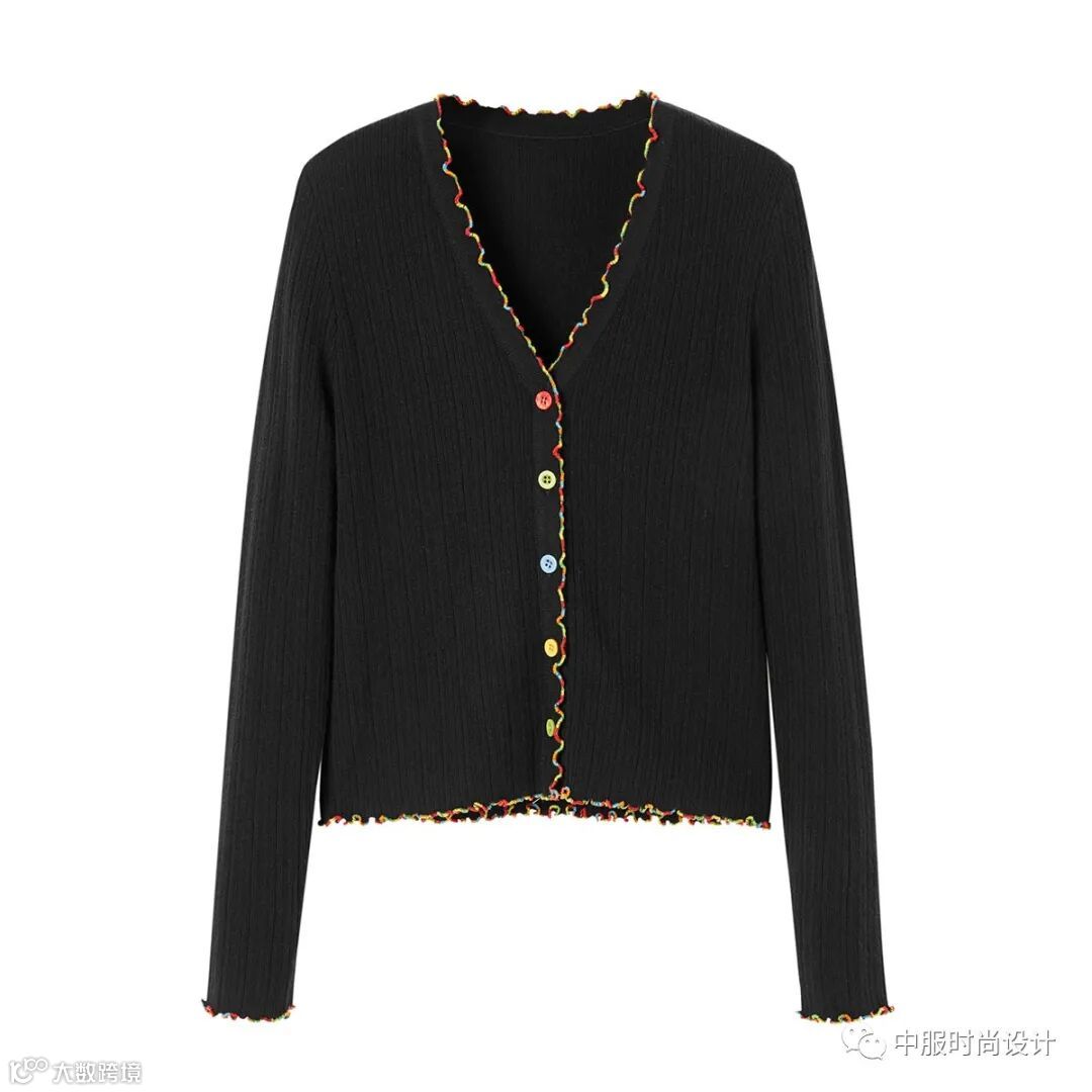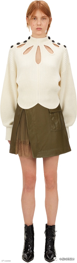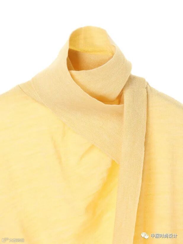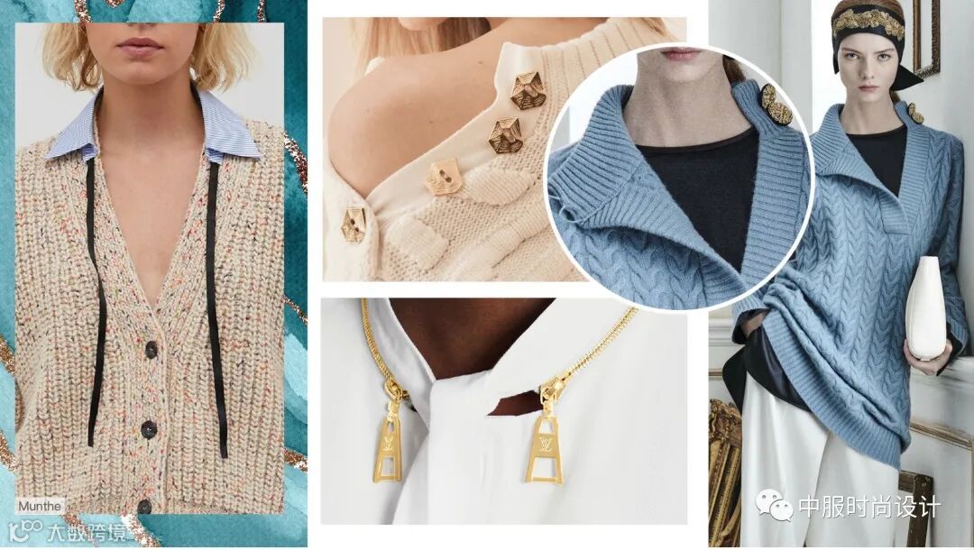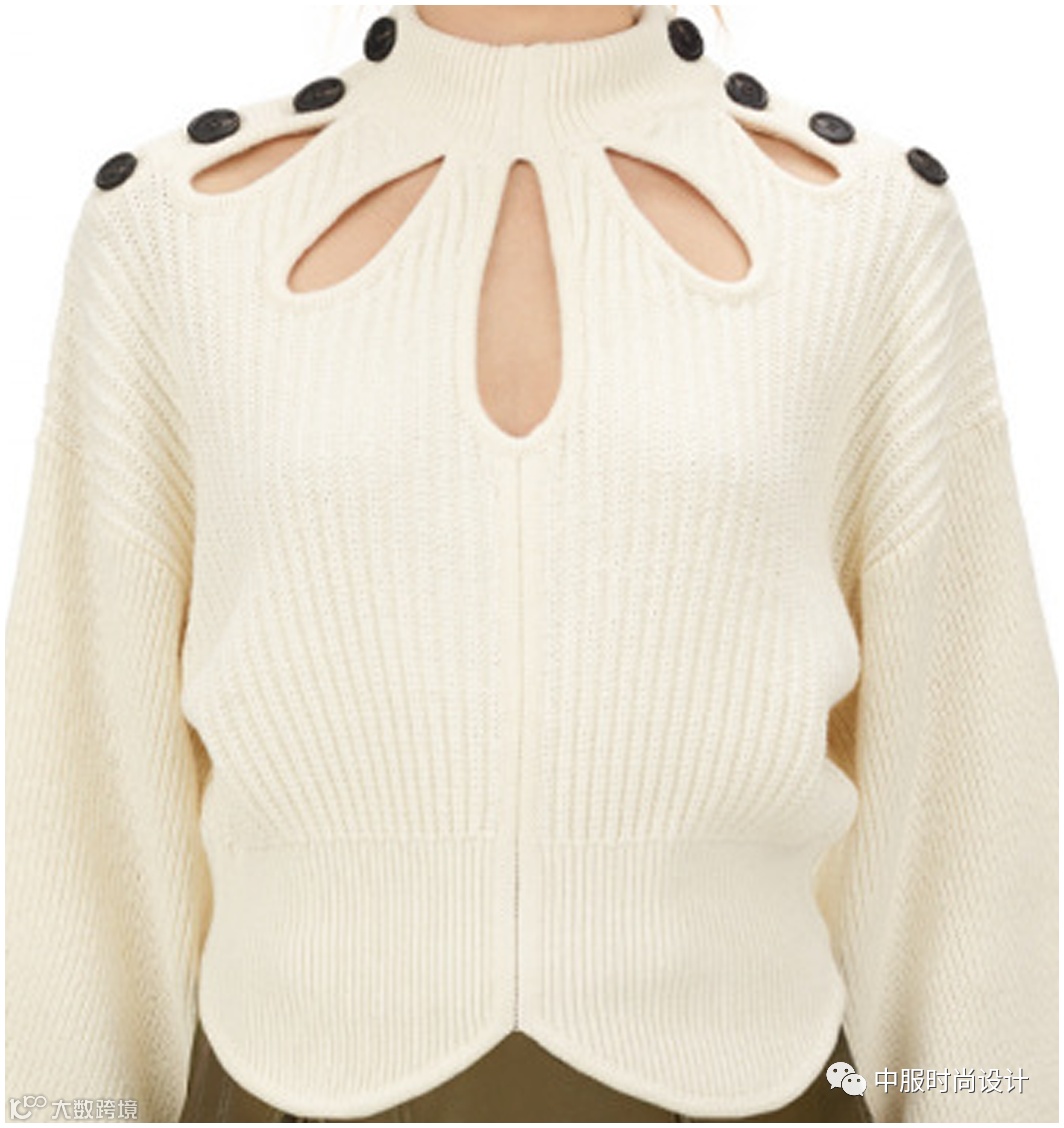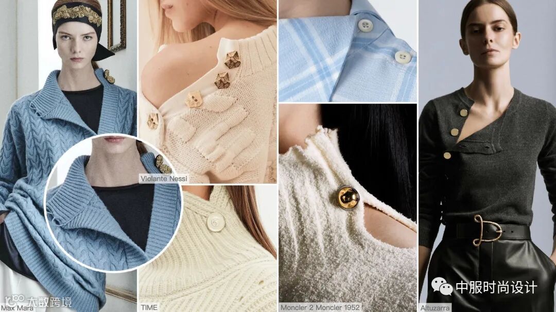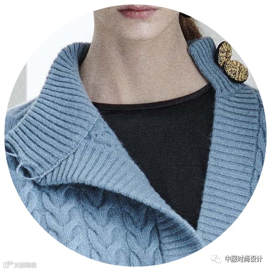 扣子与领的组合在具有功能性的同时更加注重在服装款式上的装饰效果,需要注意的是领的开合连接不在领部正中而是在领侧或具有一定斜度。领口闭合时领扣可做装饰点缀,将领扣解开形成左右不对称的款式又可进行造型穿搭,满足消费者对毛衫款式具有多种搭配的需求。