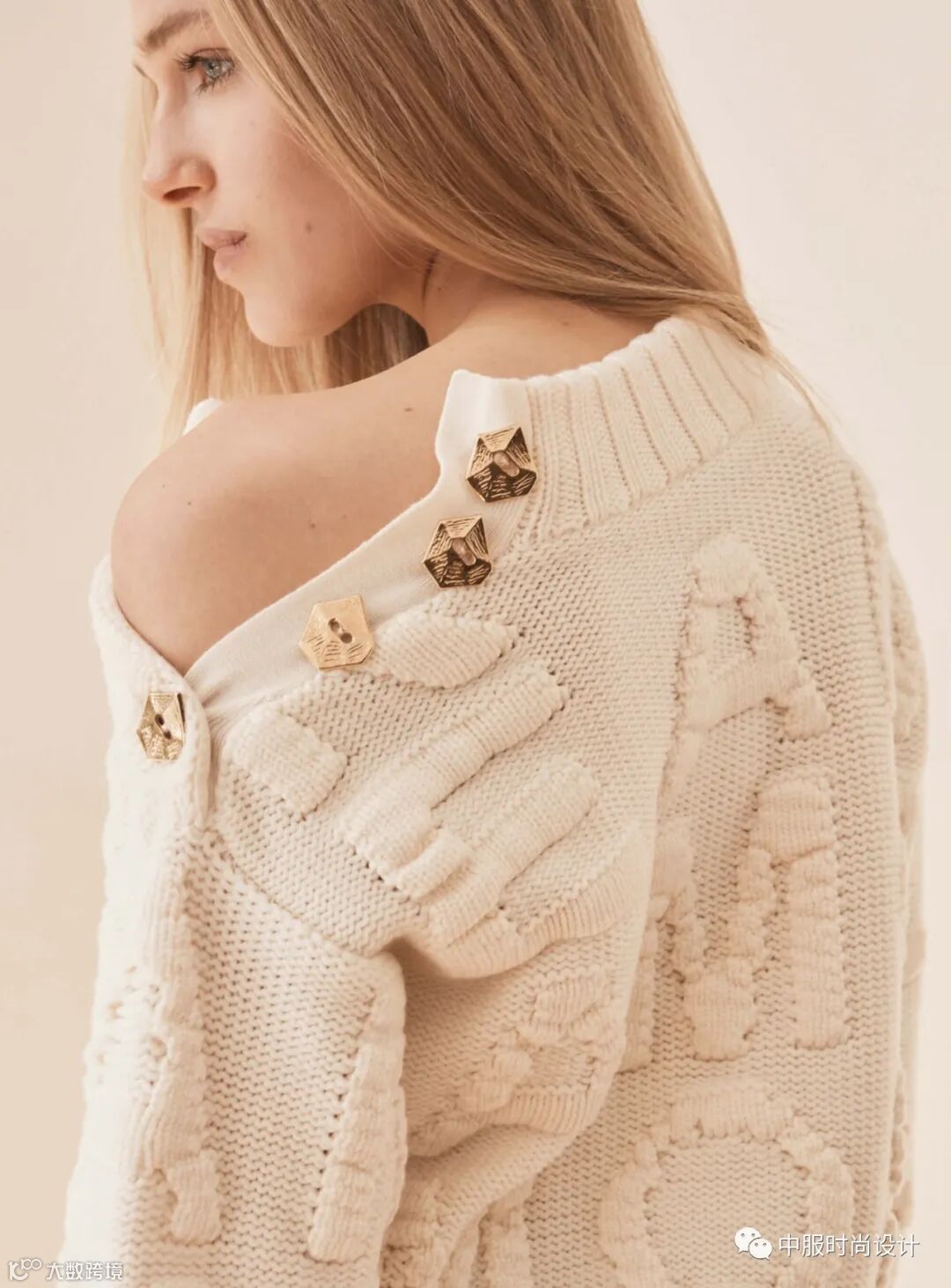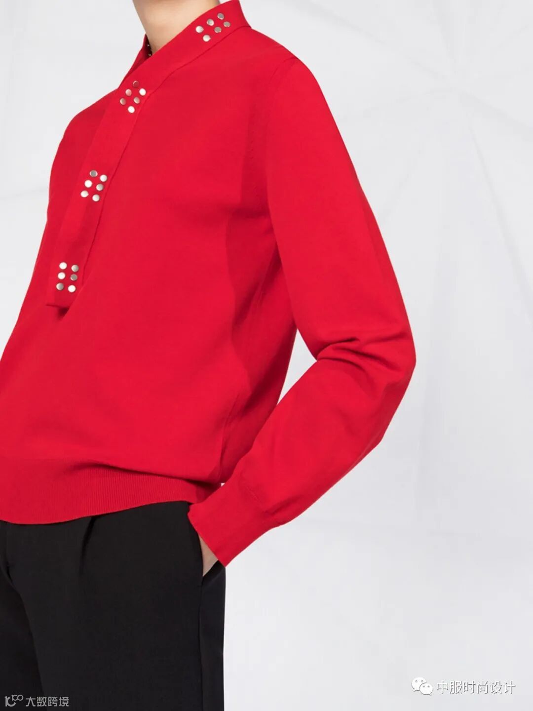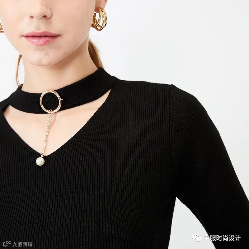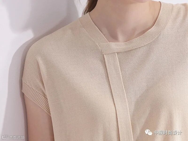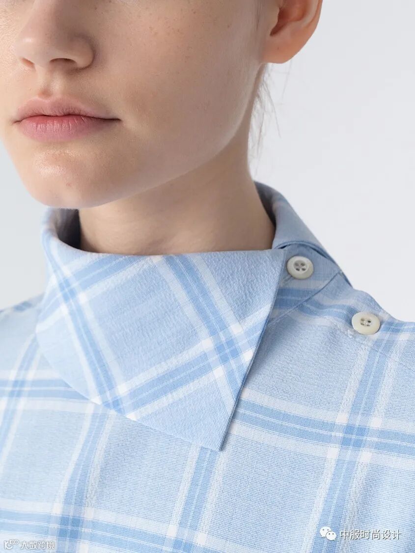 扣子与领的组合在具有功能性的同时更加注重在服装款式上的装饰效果,需要注意的是领的开合连接不在领部正中而是在领侧或具有一定斜度。领口闭合时领扣可做装饰点缀,将领扣解开形成左右不对称的款式又可进行造型穿搭,满足消费者对毛衫款式具有多种搭配的需求。