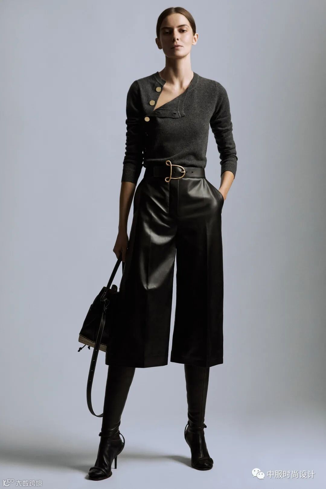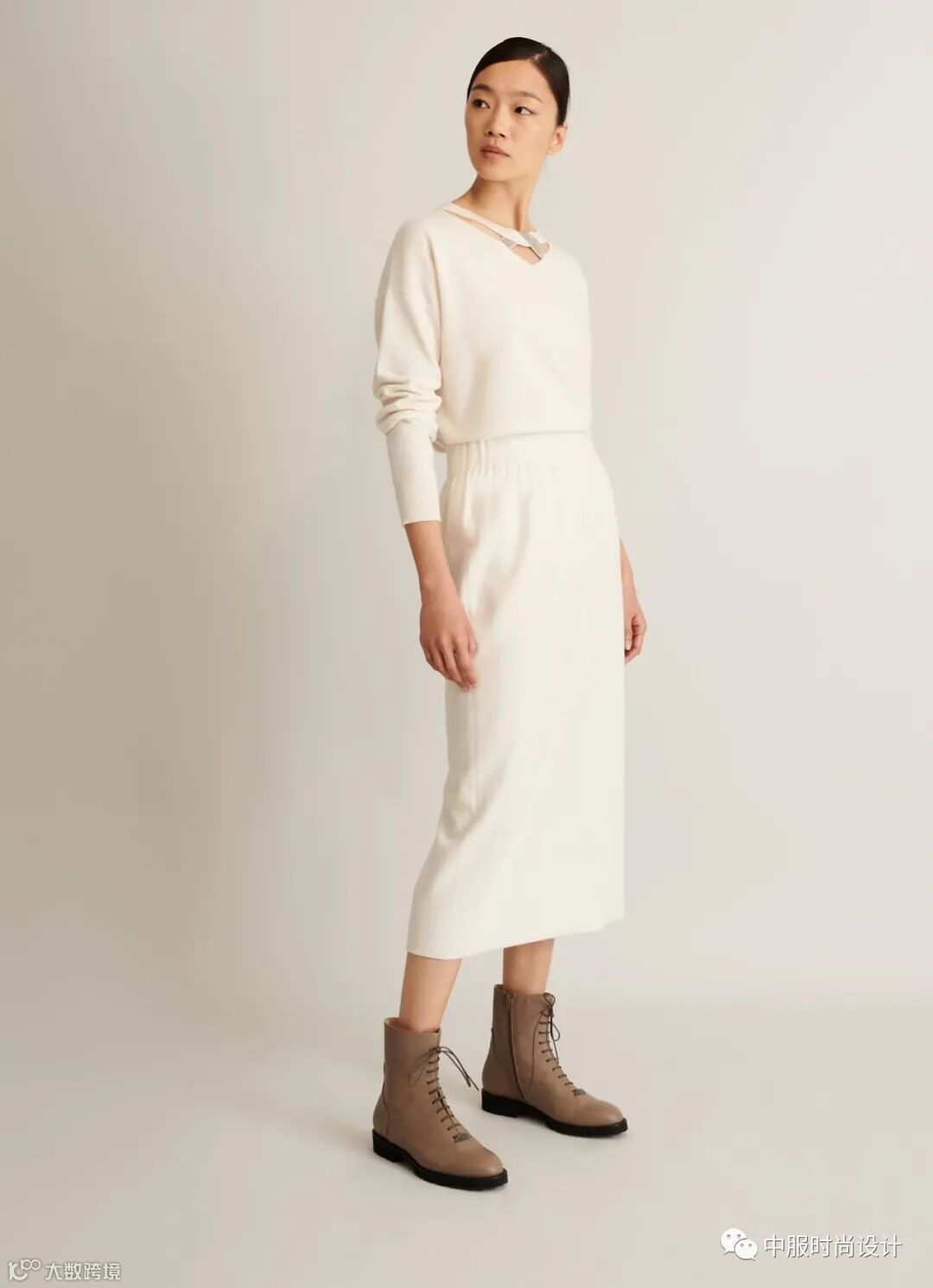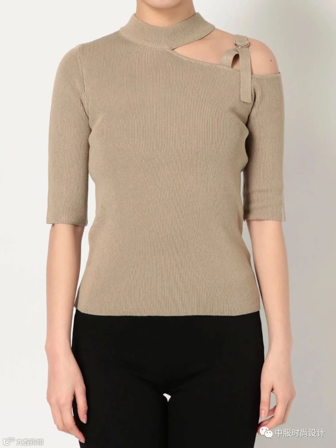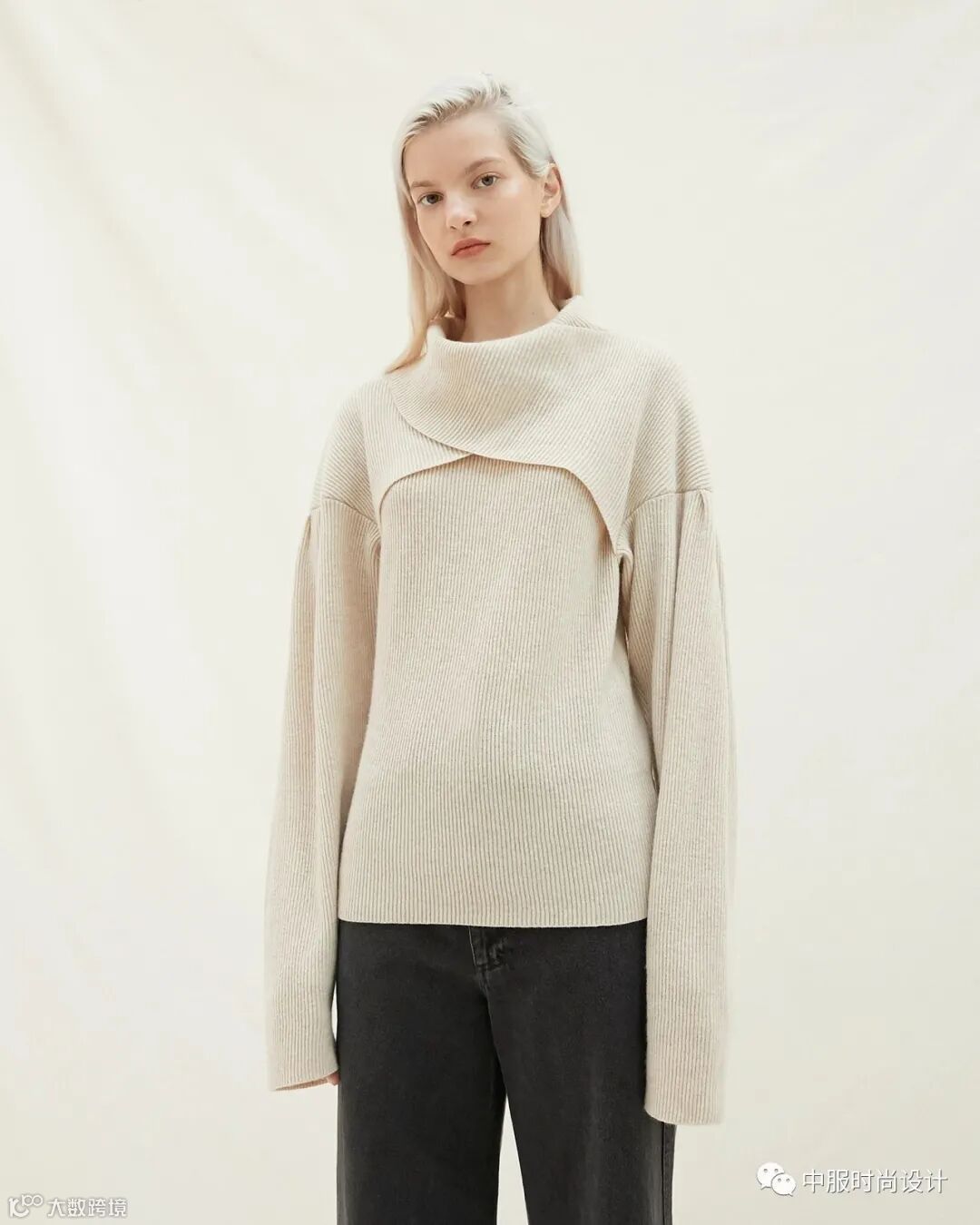扣子与领的组合在具有功能性的同时更加注重在服装款式上的装饰效果,需要注意的是领的开合连接不在领部正中而是在领侧或具有一定斜度。领口闭合时领扣可做装饰点缀,将领扣解开形成左右不对称的款式又可进行造型穿搭,满足消费者对毛衫款式具有多种搭配的需求。
