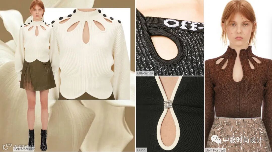 清新的花朵展现女性的柔美气质,而花朵花瓣的外观轮廓也运用于毛衫领部设计中。根据花瓣外轮廓形成的镂空形状犹如在颈部绽开一朵娇艳的鲜花衬托颈部线条,同时还可加入纽扣辅料进行装饰。