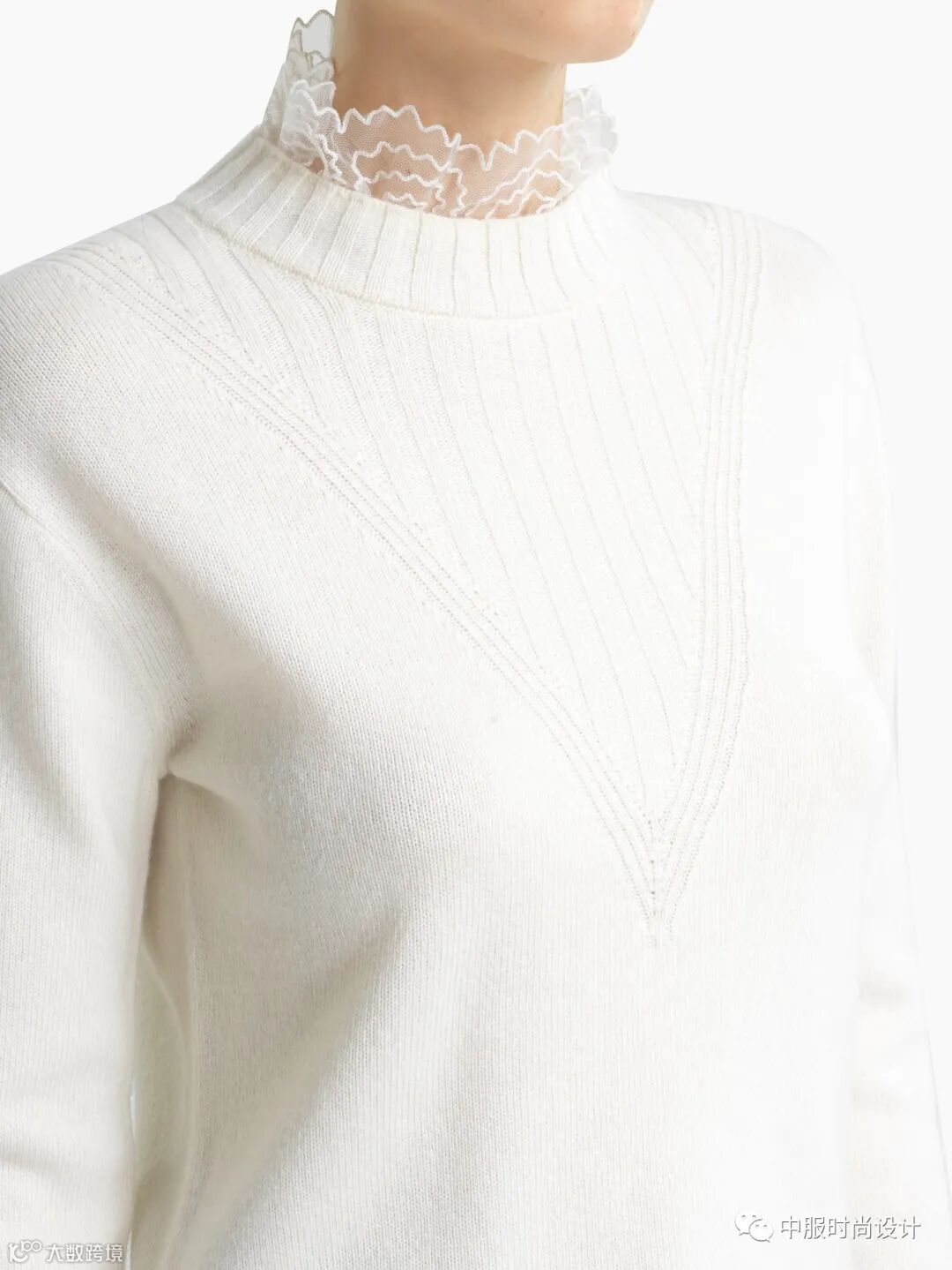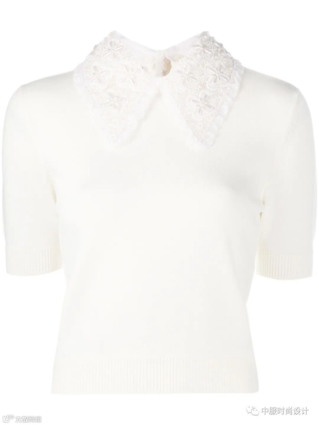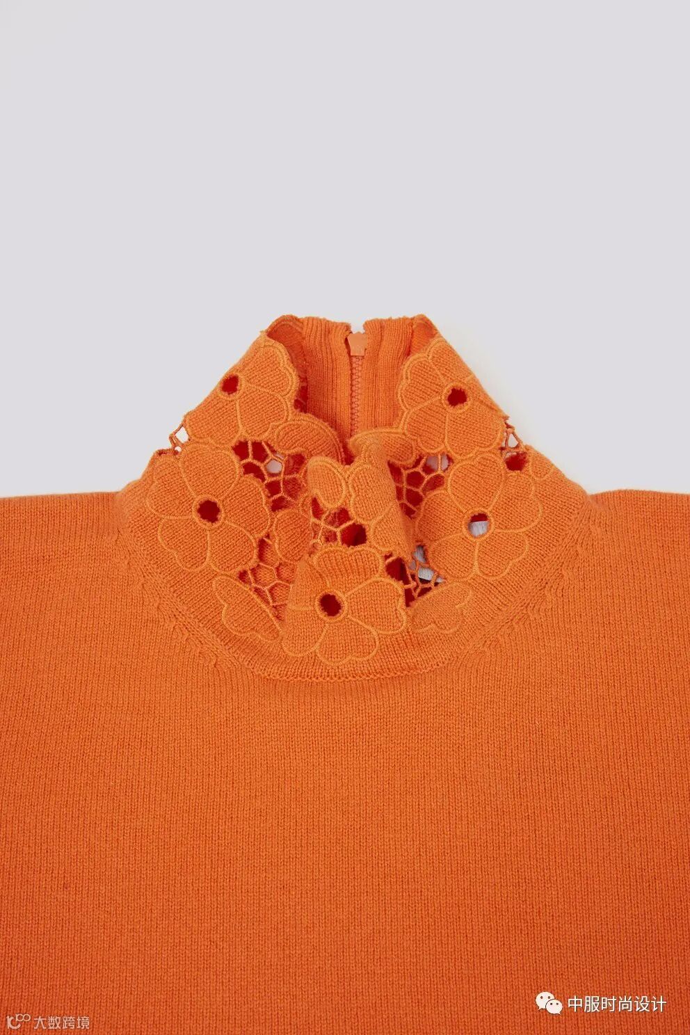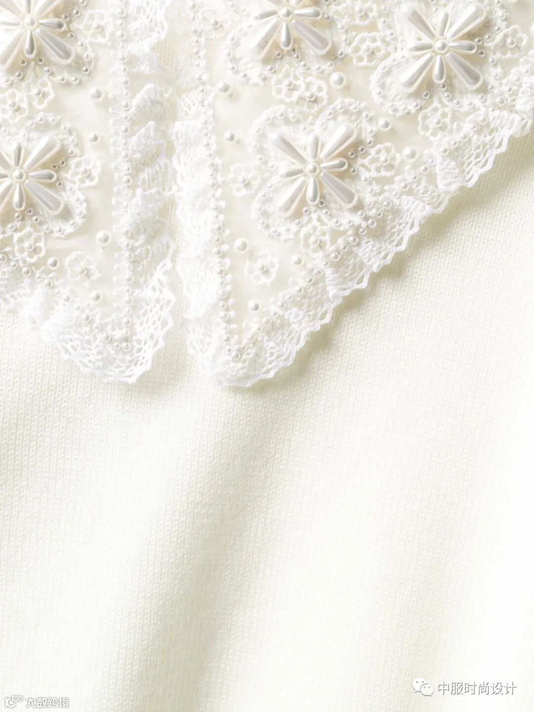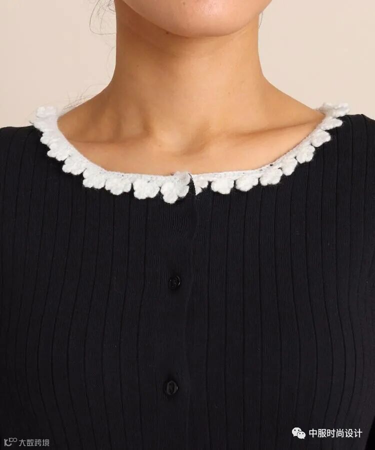 手工质感在毛衫中越来越受到人们关注。相比于往季用蕾丝进行异质拼接的领部设计,在新季更加注重领片的手工定制感。将大小形状各异的珍珠有序排列与蕾丝面料结合的领片设计丰富且立体。除在领部平面织片勾花之外,勾花在领部的叠加设计更增加领部层次。