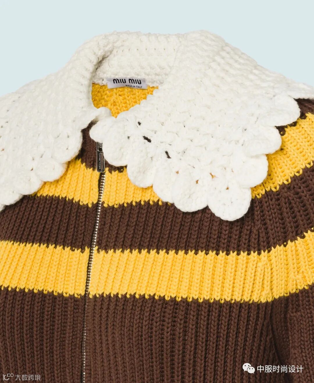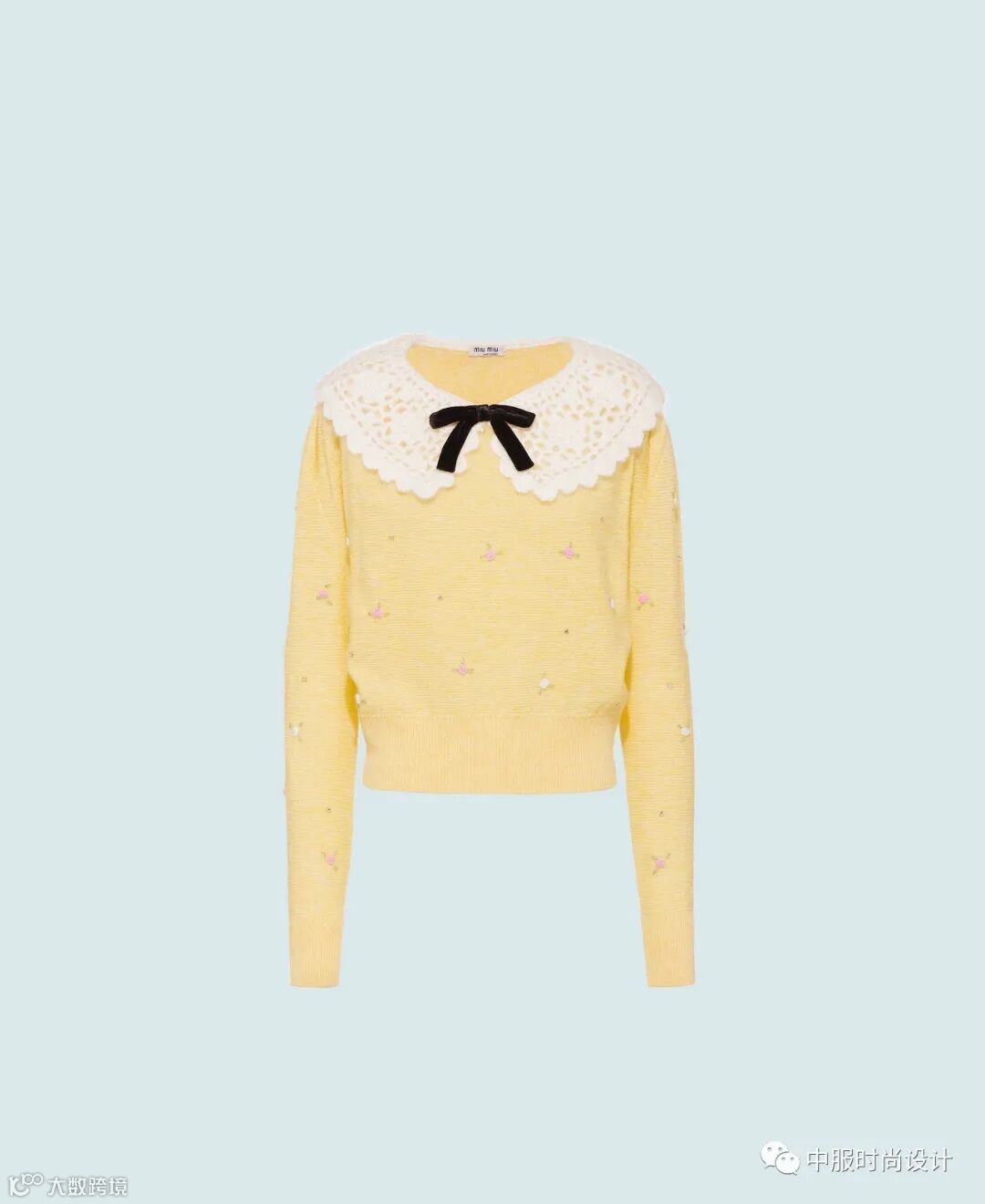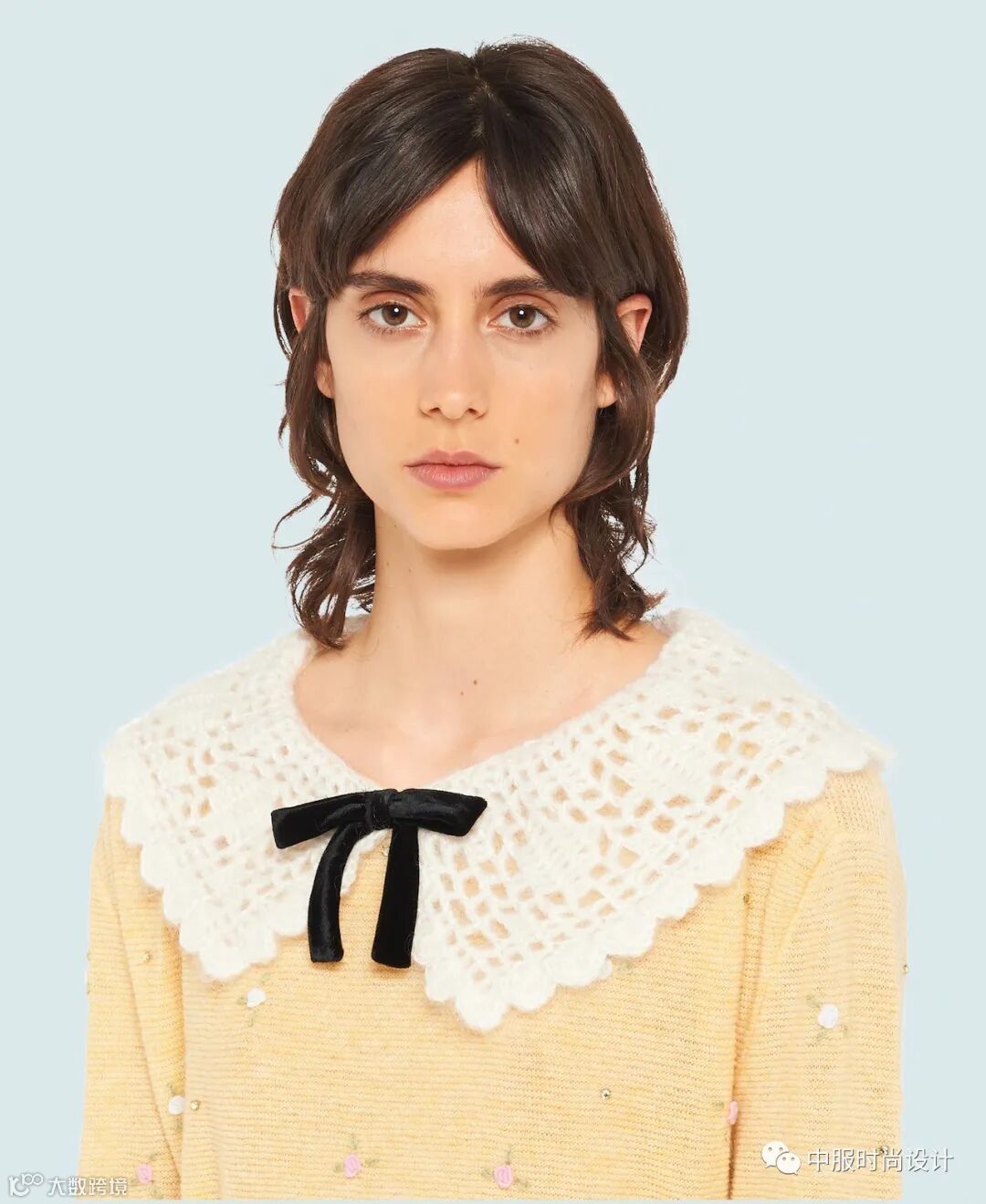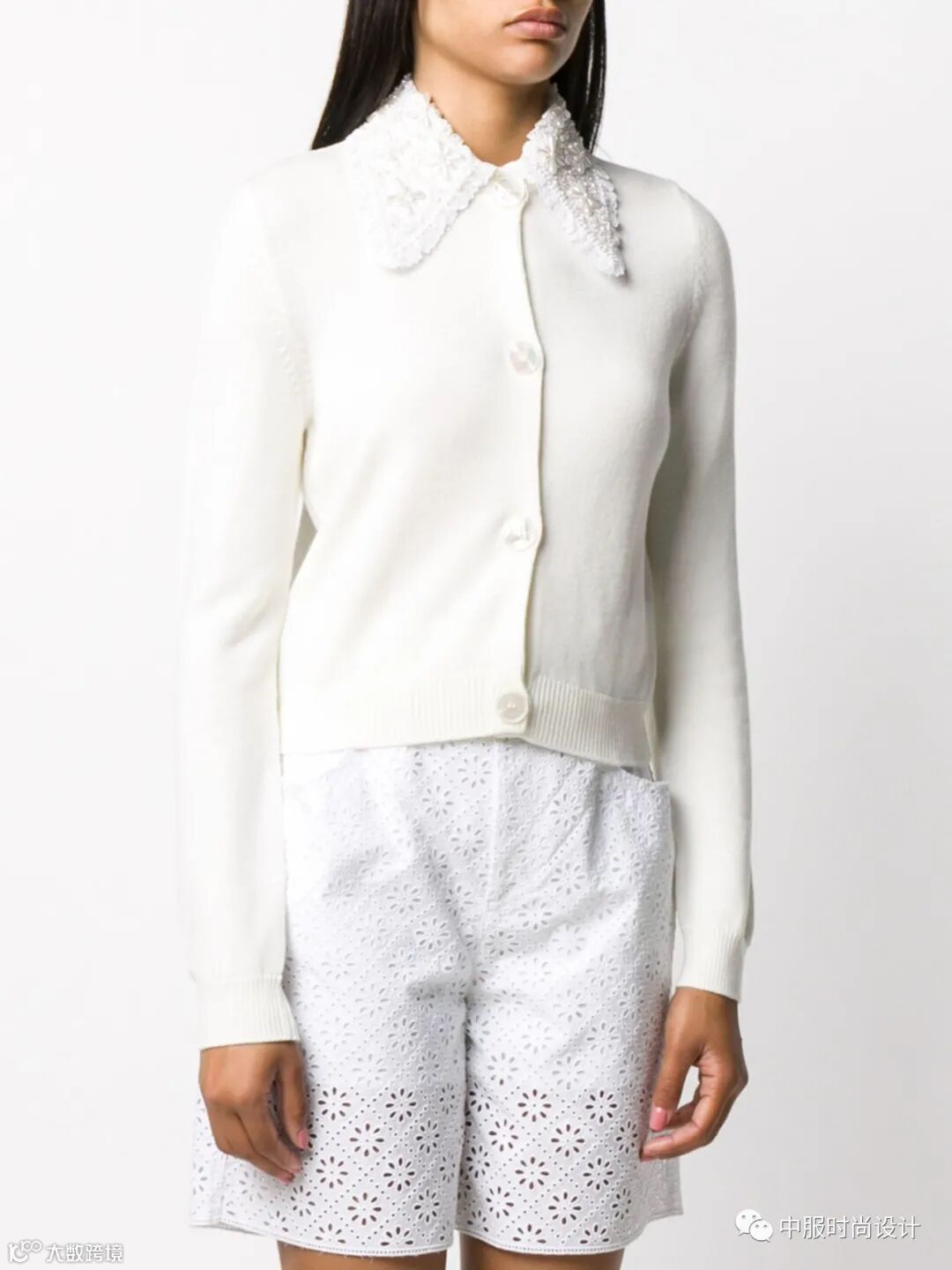 手工质感在毛衫中越来越受到人们关注。相比于往季用蕾丝进行异质拼接的领部设计,在新季更加注重领片的手工定制感。将大小形状各异的珍珠有序排列与蕾丝面料结合的领片设计丰富且立体。除在领部平面织片勾花之外,勾花在领部的叠加设计更增加领部层次。