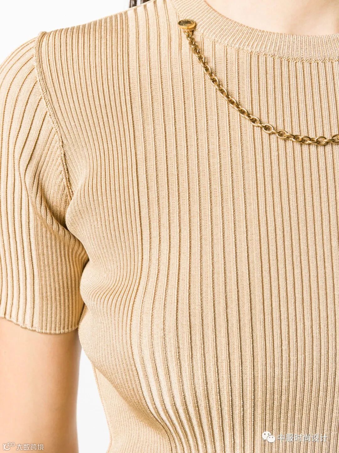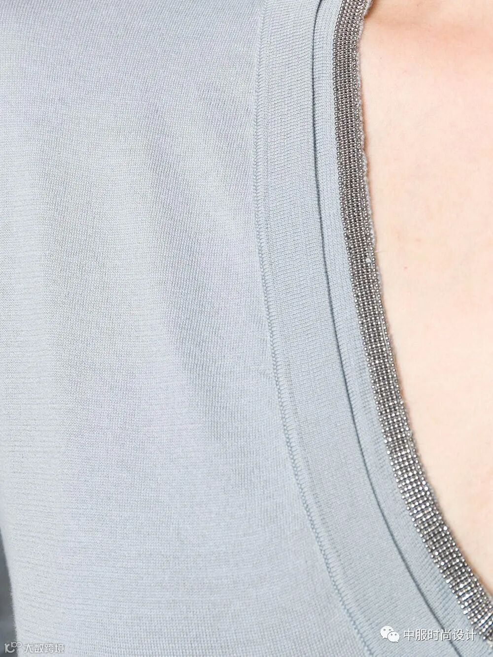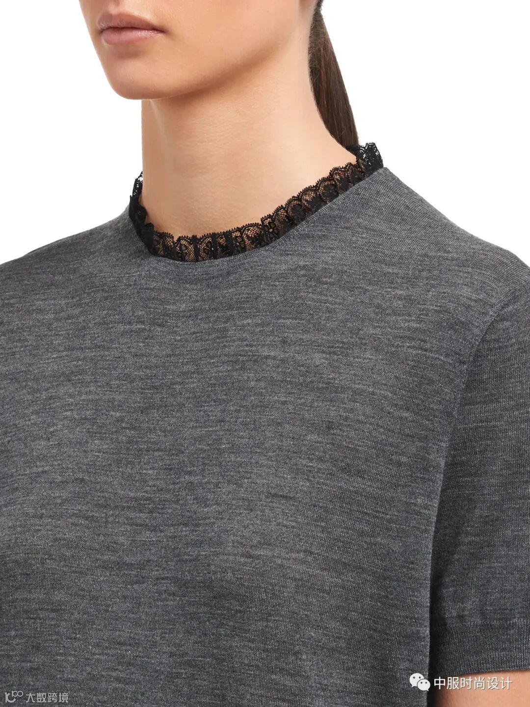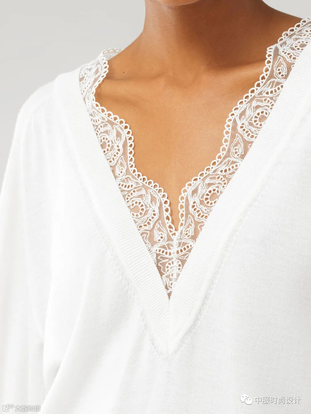 手工质感在毛衫中越来越受到人们关注。相比于往季用蕾丝进行异质拼接的领部设计,在新季更加注重领片的手工定制感。将大小形状各异的珍珠有序排列与蕾丝面料结合的领片设计丰富且立体。除在领部平面织片勾花之外,勾花在领部的叠加设计更增加领部层次。