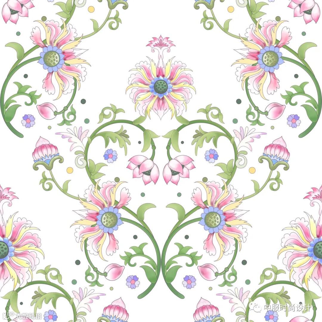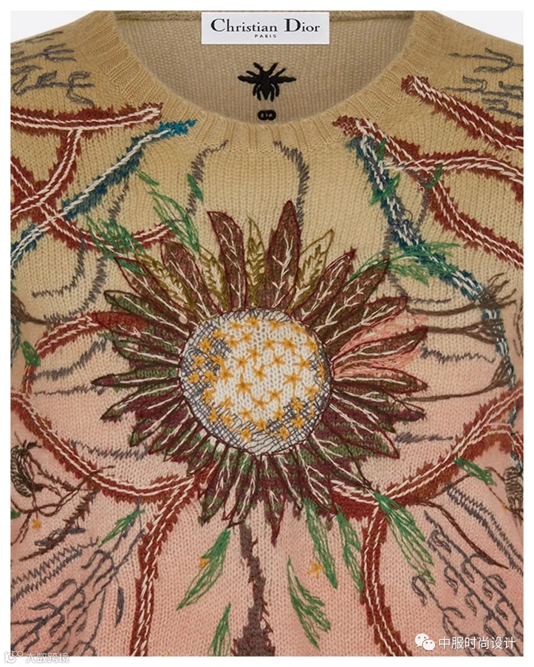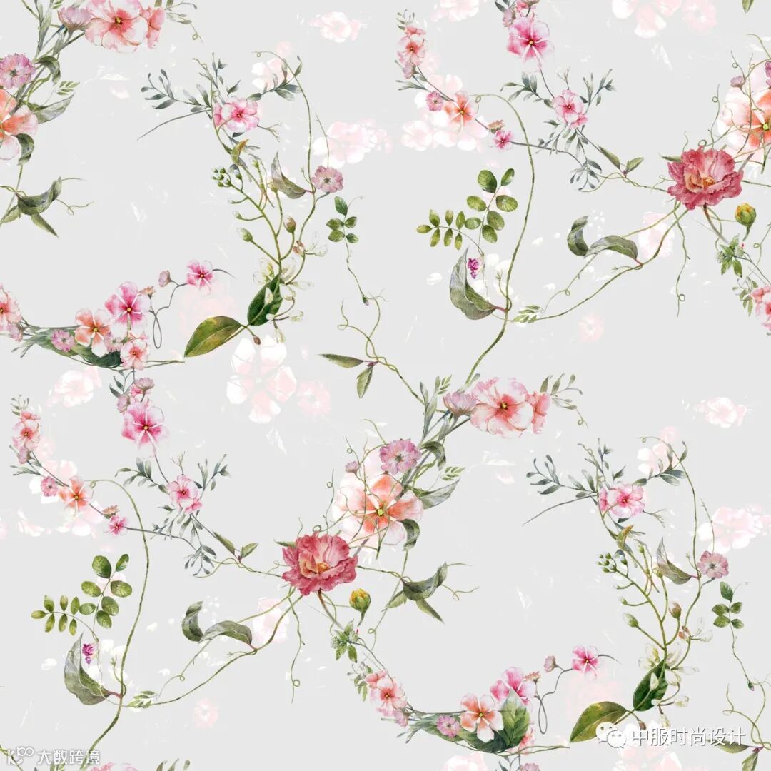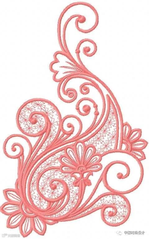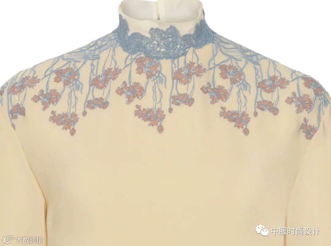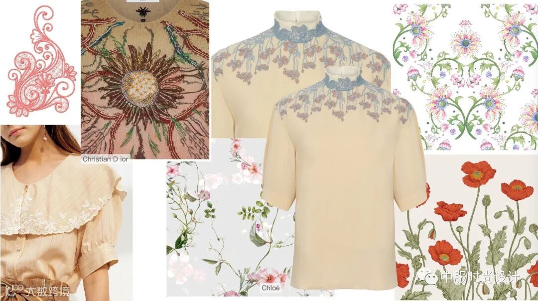 向外生长的花蔓将领部包围缠绕,给人欣欣向荣的视觉感受。花蔓图案可通过机绣和电脑绣花工艺运用在毛衫款式中,在领部还可增加蕾丝面料进行搭配设计增加层次感和精致度。